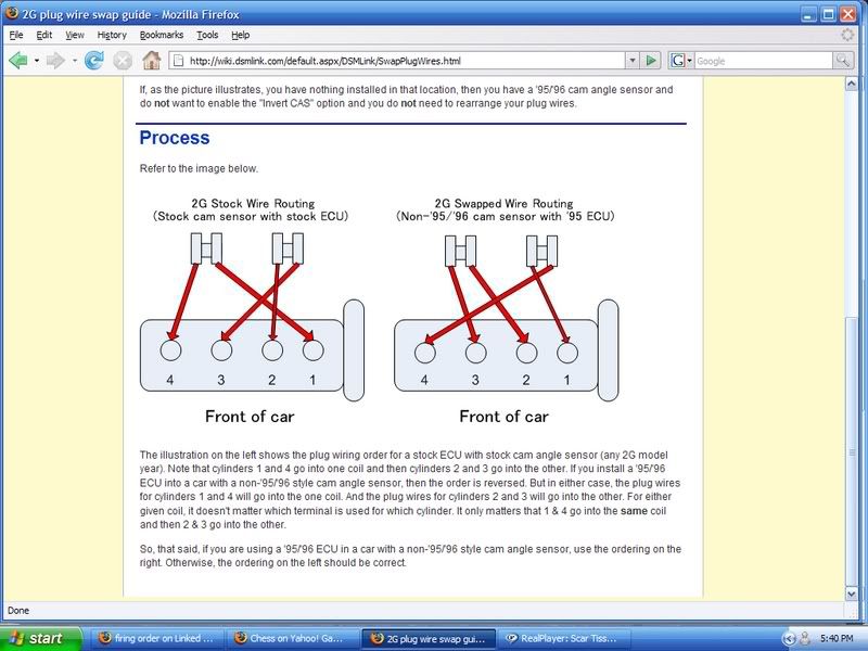 ok, so i cant get my 99 to fire up, i changed the computer today, to the linked 95 eprom (i was told it was in working order uppon purchase and it better sure as hell be!) i swapped 4 with 3, and 1 with 2, and the car just cranks, the DSMlink chip is burned for 950cc fic injectors, which are installed on the car... all lights on the dash work, and it turns over, but no firing... just keeps cranking, i have fuel pressure, but not sure about the injectors (i'm sure they are giving fuel they are brand spanking new!) then i put the plugs back to the oem place thinking maybe, just maybe for some reason mine wouldnt be switched... nothing happened... can someone explain to me from the cam side of the block, the order the plugs need to be hooked up!?!?!