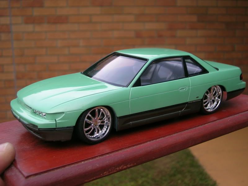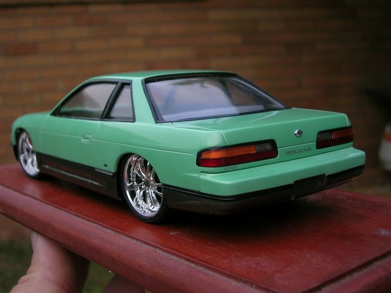 Its not finished yet, no interior, engine or suspension work done on it at the moment.... the wheels are just mocked up under the body. The trunk emblems are all kit supplied... the lock cylinder has a small chromed plastic part topped with a decal and the "Silvia" is just a silver decal. Regards, Dan