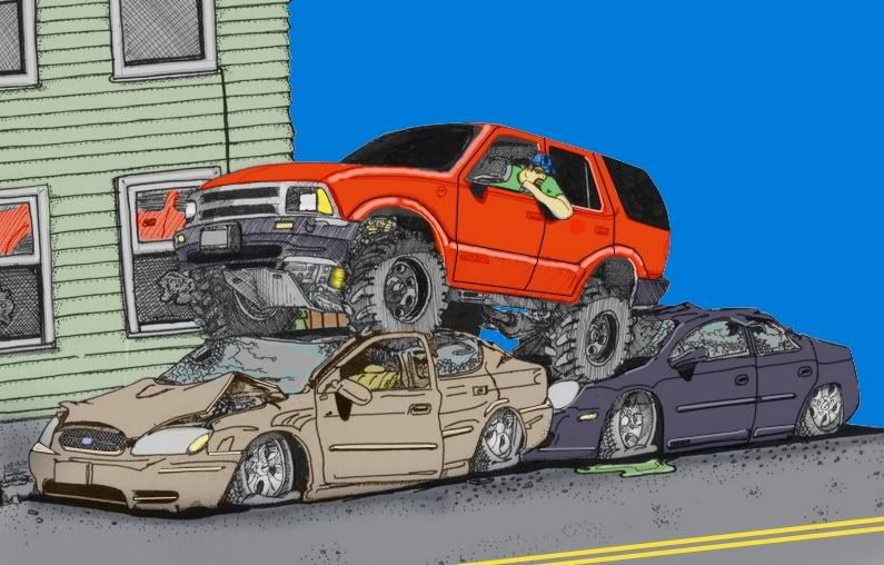 Well if u have been here for a lil while, u have seen this drawing of my truck parked on top of my neighbors cars. I decided to liven it up a bit with photoshop. check it. Nothing over the top. Just colored it.