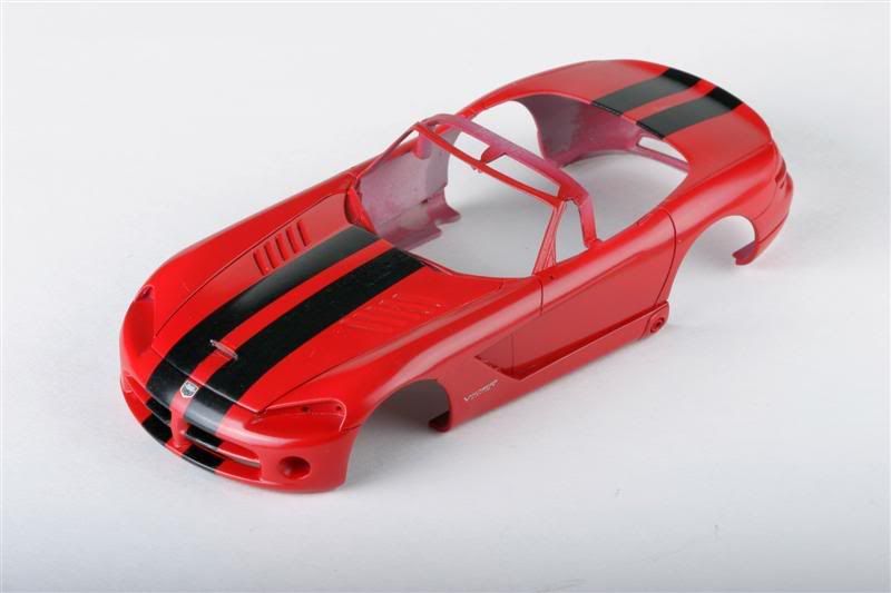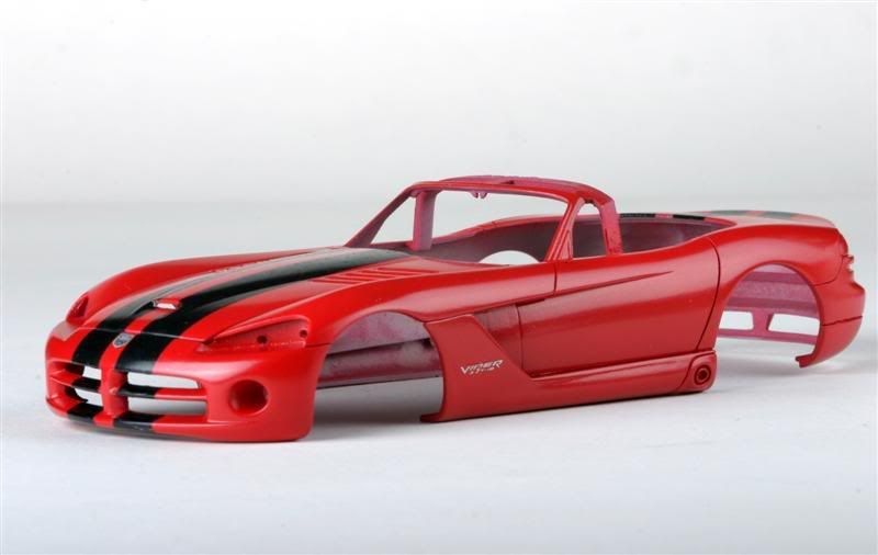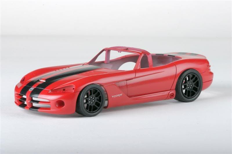 RoG's Viper SRT-10. Seems like a pretty good kit, although from what I read, ride height needs to be addressed. Color is dupliclor Bright Red decanted and airbrushed. Black stripes come from the Revell Viper Coupe SRT-10.