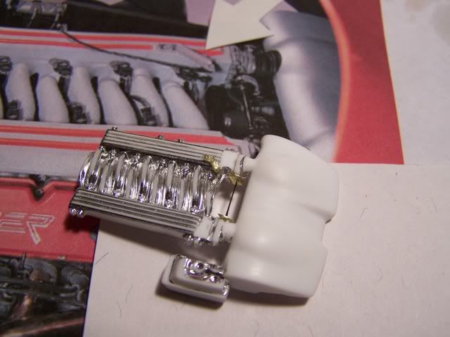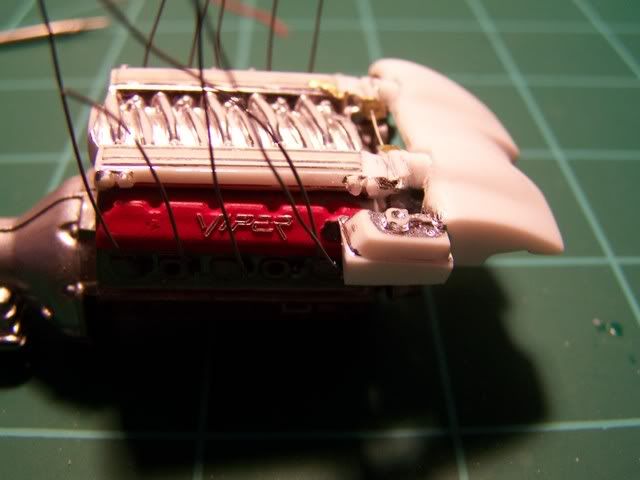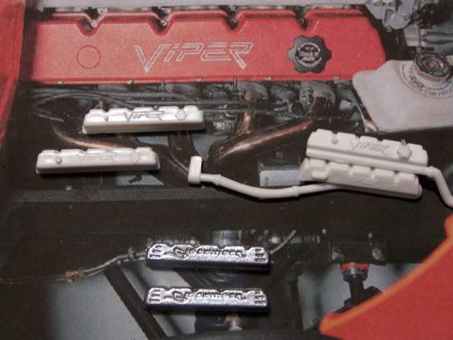 hello all I have been working on my Dodge sidewinder truck. I wanted to make it as real as possible so I took some time to look over all the images I have on the truck. I didn't know how they linked the throttle bodies in the engine valve cover til now the pic ihave show the truck when it came out at it's first SEMA Show. So I wanted to make all the linkage out of sheet plastic. but I have so much thin Brass sheet and like the way it makes thing look more real. so I used that and all that sheet plastic. I needed valve covers off a the VTS truck the valve cover that come in this kit are rong for this build soI mad moldes of the right ones and placed them on the engine. First images of the engine at the start then the brass linkage and wireing stuff.