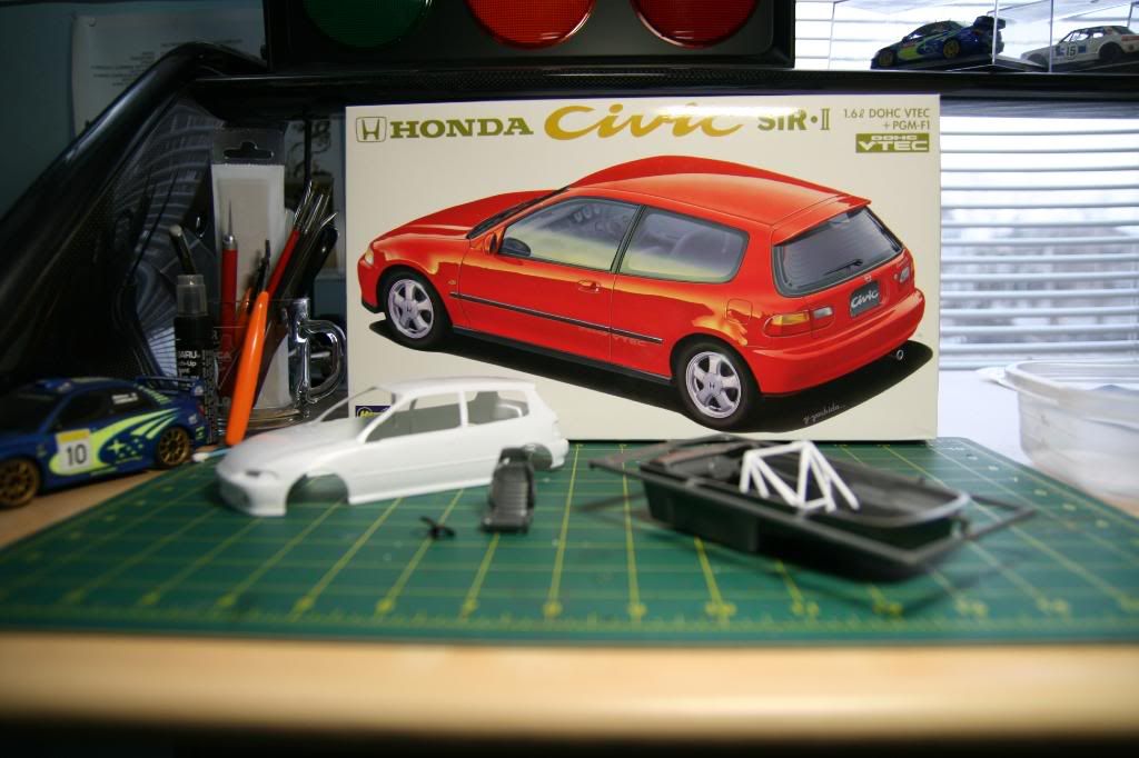 I miss my '00 Si and I've always liked civics since then so I picked up the Hasgawa EG hatch kit. I want to do a striped out auto-x/track car styled build. I have to find some scale 15 inch wheels for it. I'm also trying out some Testors "One Coat" Lacquer I found at my Local hobby shop. This looks like what Testors is bringing to the table to compete with Tamiya Sprays. I'm also using this kit to practice building a roll cage and some other minor detail things.