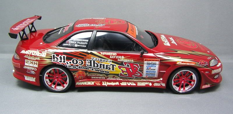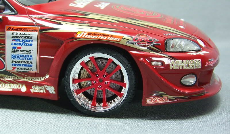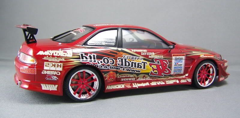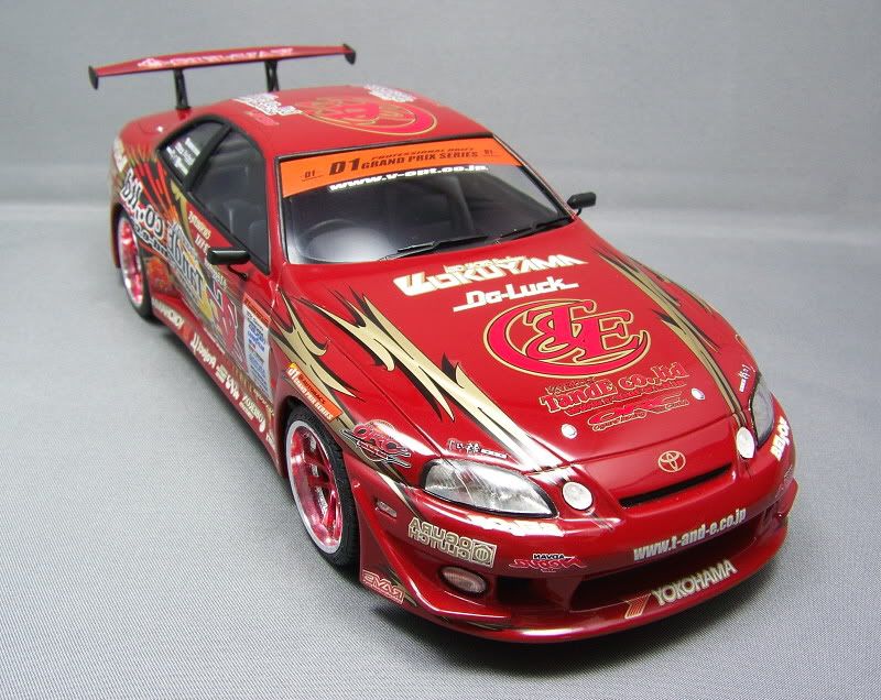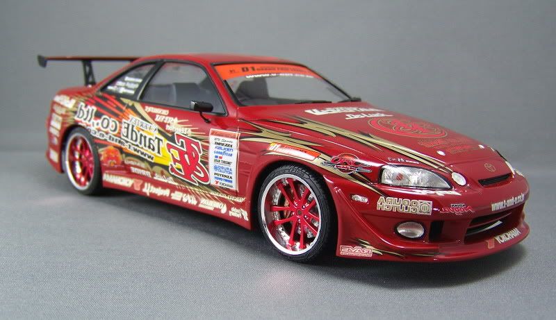 Although it's a D1 race car the kit has very little in comparison to the real race car. No role bar, full street interior (although there were racing front seats provided), street glass, very poorly done disk brakes that look like disk brakes off of a street car from many years ago... maybe!. The chassis is narrower than the body but overall the body is pretty decent other than the front winglets are a little thick. With all of this in mind I suppose I would describe this kit as more of a street going replica of the real D1 car. So I used the normal seats and held on to the race seats for a future project. I also changed the brakes to something a little more realistic from a Fujimi wheel set. I also changed the wheels to something a little easier to paint. These have separate outer rings and the ones that came with the kit didn't, although the wheels are vaguely similar in style to what came in the kit. Body is painted with Testors lacquer Flame Red, Tamiya Clear and polished. Wheel centers painted with Tamiya Clear Red. Decals where very dull and I'm always afraid to clear them so I polished them out with a little "Treatment Model Car Wax" and brought them to a nice shine. Overall I had a few issues with some of the decals and how they reacted to solvent and I tore a couple of them during application .Also trying out a new photobooth and lighting... Anyway, thanks for looking... ![]() ![]() ![]() ![]()