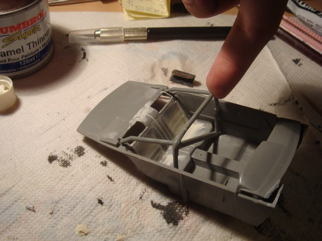 HI! You have to cover those holes with styrene and putty and (in my opinion) you should do something with backseat, it will look odd with rollcage and seats. Race cars are "empty" inside. I would leave the centre and cut out seats and replace them with styrene.Its an RWD car. I will find some photos later to show you what i mean. Shape of your cage isn't to good, best way to find out about it is to check threads with race cars to find an idea how it should be done. I know how hard it is to build something without pics. I'm trying to finish an Escort MKII I've start few months ago. Keep up working!