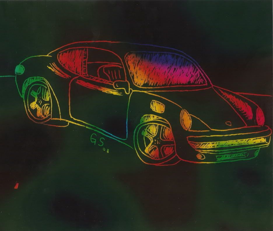 By the way, here's the actual sketch I did. It was done in about 20 minutes with no references, so I say Porsche style rather than actual Porsche because I'm sure I missed some design cues. The actual scratching process took less time once the design was sketched out on the back of the scratch paper. I'd say over all an hour. For a first attempt, it's ok. I bet someone could do something much cooler with this stuff.
