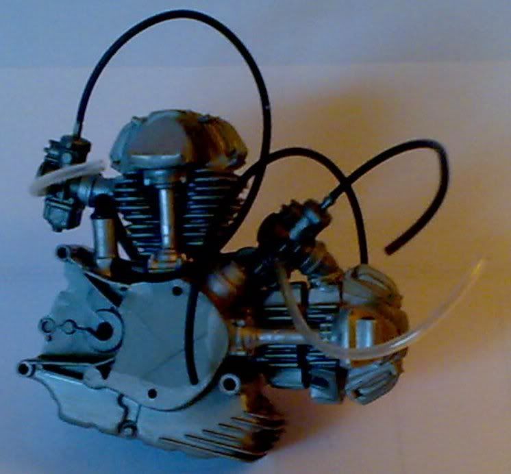 After 2 years and a few uncompleted threads/builds, I'm trying to make a comeback to modelling and other things. In a nutshell I'm building from a hospital so I have very limited working time and basic tools only. I choose this as an easy kit to try get get back into building and also it should require too many mods/fixes. I'm building OOB. I've choosen the below bike from Tamiya. I already see plenty scratch building opportunities but I'll have to keep this one simple. http://www.motorbike-search-engine.c...ti_ncr_900.jpg Please excuse photo quality. Taken from my bed side with a cellphone camera. I do welcome comments and criticisms. I've spent 3 days getting the engine completed to a semi reasonable level. You can tell this is one of Tamiya's older kits (I believe there is a re-release??). A bit of flash but horrible mould lines on engine parts and tyres. Wheels are also done, but I'll post pics later. ![]()