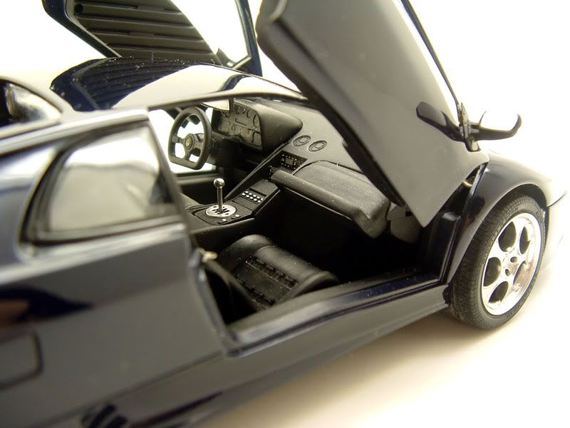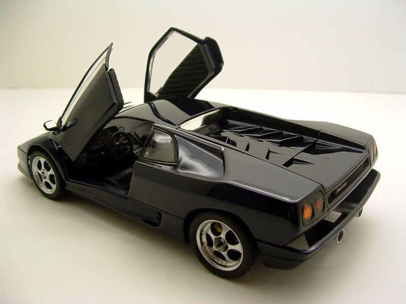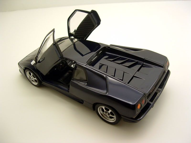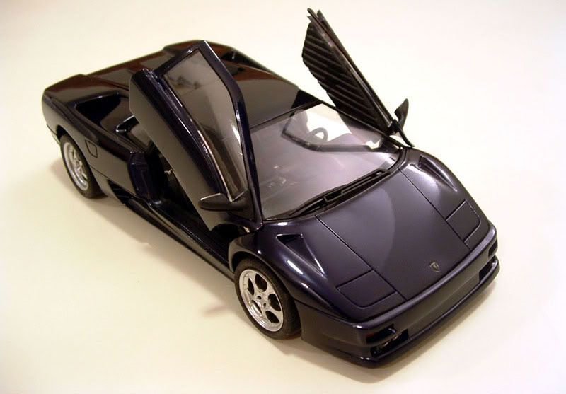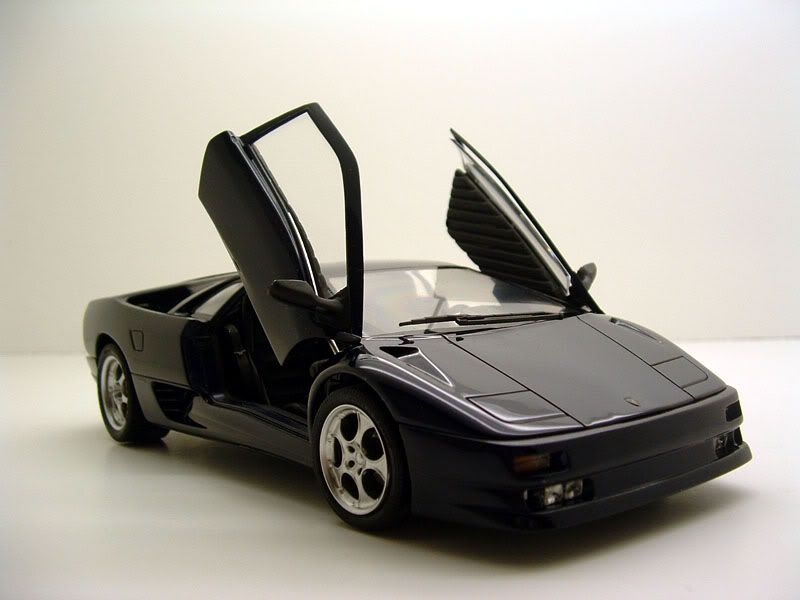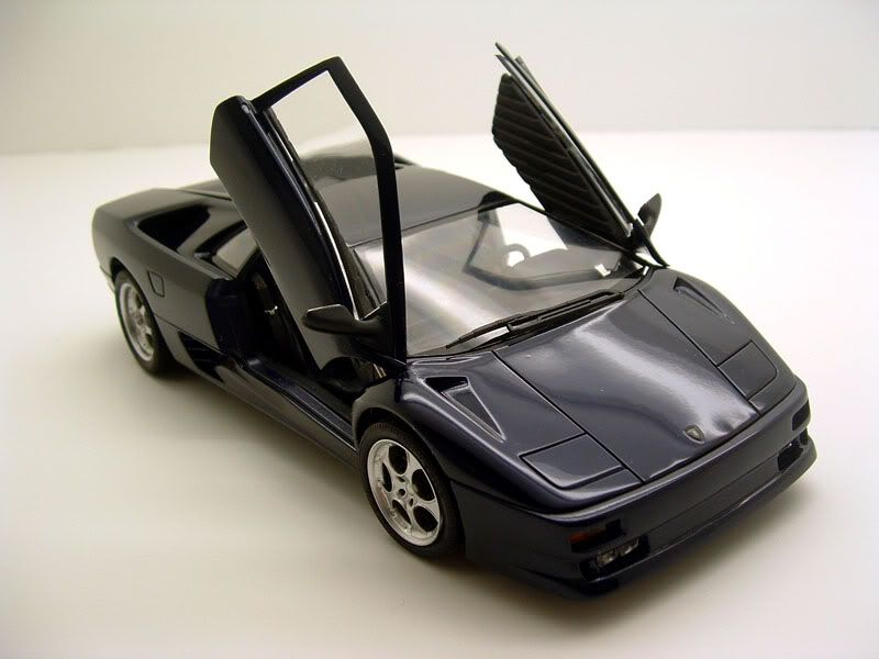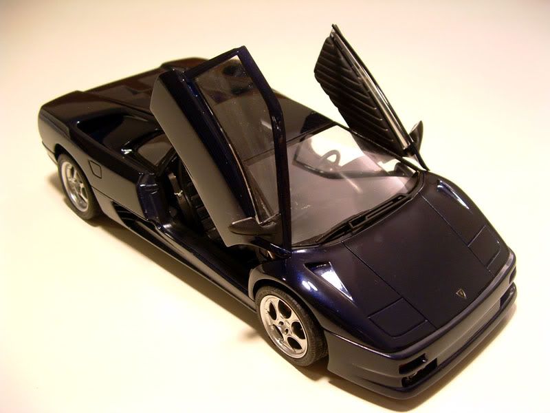 My latest project is this piece-of-something-else Fujimi Lambo Diablo modified by Koenig. I've never seen one completed, so when Squadron had them on sale for $10.63, I decided to try and build it. The kit is decent, but the door fitment is just not very good. So, this one will be displayed with open doors. Pardon the dark pictures and dust .The exterior was painted with TS-53 Deep Metallic Blue straight from can. ![]() I stripped the original plastic chrome, and used the TS-83 Metallic Silver over Gloss Black. ![]() ![]() ![]() I love the original OZ wheels, so I decided to keep that one for other project. I used wheels from Lambo Murcielago instead. ![]() ![]() Some paintings for the engine compartment. ![]() The shifter and gate were also painted using TS-83. ![]() There is black flocking there somewhere .![]() ![]() Here is the fitment problem I was talking about. The doors will never closed properly, there is another version of Diablo with closed doors which I bought for $12.63 from Squadron. So, that's the next project. ![]() ![]() I like the wingless look on Diablo. ![]() Thank you for looking, comments and critiques are encouraged. |