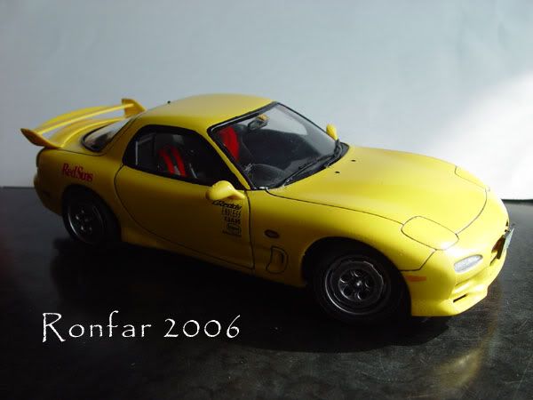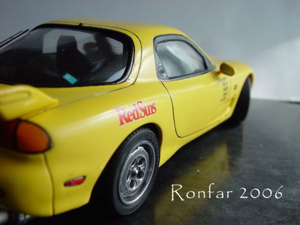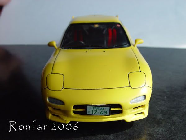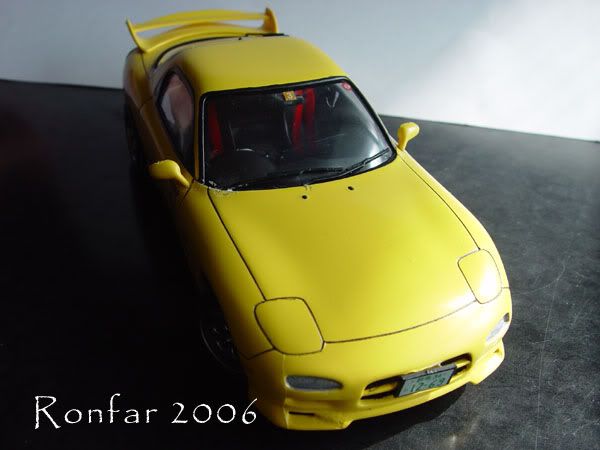 Everyone needs a yellow FD3S for their collection. Fujimi wipers really suck, however. I blame the crappy fujimi wipers for a blemish I made on the bonnet trying to get the damn things to not look stupid. I did this kit in a week, ribbon seatbelts, flocked carpet interior. I should have clear-coated over the decals and then polished but was lazy and polished the paint and then applied decals. It isn't as shiny as I'd like it, the more I look at it.