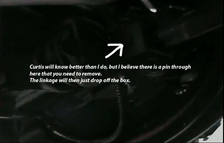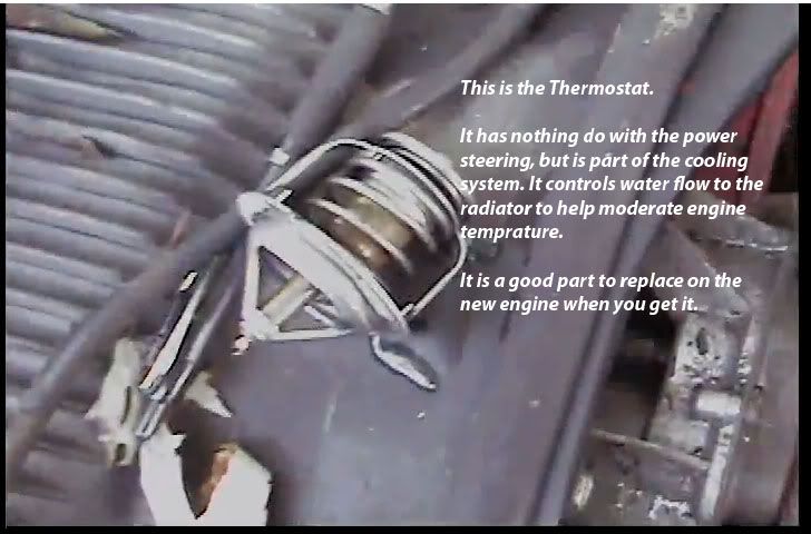 so the power steering pump is an entire bracket. that thermostate, thats not attached to the power steering pump? hmmm. question. when I took that apart fluid came out. im assuming it was water and antifreeze correct? and the shift linkage has a simple pin to remove? The picture wasn't too clear and really dark sorry.