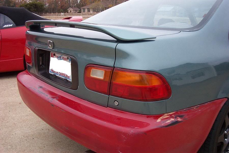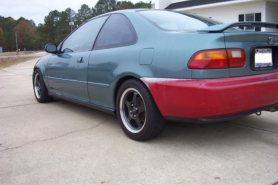 The paint looks pretty good so far. I have yet to block and buff the entire car. I blocked the entire roof and trunk and some areas where there was heavy spots. After that we buffed with some cutting compound then with polishing compound. Worked real good. The paint blings nicely. I'm going to go outside and take some pics while I'm thinking about it. 10 minutes later: Ok heres some pics as it sits now. Ignore the red bumper, its temporary. I'm in the process of painting the bumper off the white car green to go on this car. Also I forgot that this car has eibach sportline springs on it donated from the wrecked red 94 si. ![]() ![]() ![]() ![]()