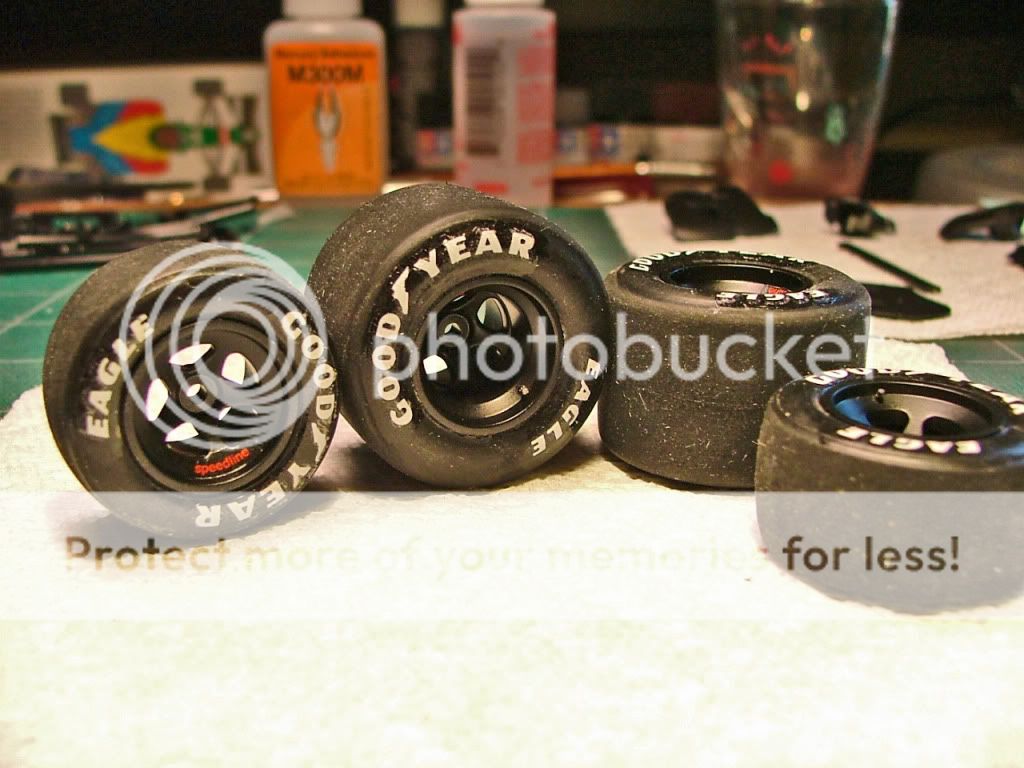I mentioned at the end of my last post, that I would show you a simple tire scuffing tool I have made. I‘ve been using this thing for some time now and it works pretty well. All you need is a variable speed drill and some flat washers, a bolt or screw and a hex nut. The size of the hardware I used to make this tool is good for 1/20th and 1/24th scale tires. If you are going to scuff tires for a larger scale, 1/18th or 1/12th, then I would just scale up the hardware accordingly. You could use Metric or American Standard hardware. I went to my local Home Depot store and bought my selection of flat washers, a hex nut, and a long screw. I took a set of Tamiya tires along with me from one of my F1 kits, so that I could pick the correct sized washers that I needed. This is a simple screw, washer and hex nut hardware stack up, and it cost me all of a $1.50 US to make. REALLY SIMPLE and CHEAP!! Here is what I use and the quantity: Large flat washer, qty 2 ( rear tires, approx 1.25 outside diameter ) Medium size flat washer, qty 2, ( front tires, approx. 1.00 diameter ) Small flat washer, qty 2, ( needed to help align screw when tightened to tires) Screw, ž-20 x 2.00 long, qty 1, ( I used a flat head screw so it self aligns to the smaller washer ) Here is a shot of the hardware I used. ![]() And this is another shot built up. ![]() I felt the outside diameter of the washers was important because you don’t want the washer diameter to exceed the tire diameter. If the flat washer is larger than the tire you’re scuffing, it will make scuffing the “shoulders” of the tires difficult. For that reason, you want the flat washers to be just a bit smaller than the tires. Front tires on F1 cars are smaller than the rear tires and you’ll see in the pictures what I mean by the tire and washer being close in size for scuffing. This is what the tool looks like when assembled. I don’t worry too much about trying to “center up” or “align” the tool right through the center axis of the tire. I align the outer diameter of the washers as I tighten the hex nut. I purposely used a flat head bolt because the conical shape head, self aligns in the hole on the flat washers. One thing I also like to do is tighten the washers just enough to “crown” the tire. This makes it easy to remove the center mold flashing line found on most tires. It also makes it easy to roll across the entire surface of the tire and control just where you scuff, and how much you scuff. Lovely mold lines there huh? This is a rear tire. ![]() All you need to do is chuck the tool into your drill, start rotating the tire slowly and apply your favorite sand paper. I like using a small sanding block to scuff the tire, plus, it’s a hard surface and works best for applying pressure to the tire surface. ![]() This is the after shoot. Much nicer. ![]() I like the Tamiya tire decals, but I don’t really like the glossy material that can be left behind after you apply them to the tire. They look good and after I weather them a bit at final assembly, they should look a little better I bet. ![]() And another shot. ![]() I hope some of this info was helpful and maybe you’ll be making an El Cheap-o tire tool like I did. My next post will show the front and rear wings built up and maybe, just maybe, the body painted. Most likely just pictures of the dang thing all taped up ready to paint. Works been a bit slow on this kit for me. I’ll be posting more soon so be on the lookout for more. Enjoy and happy building!!