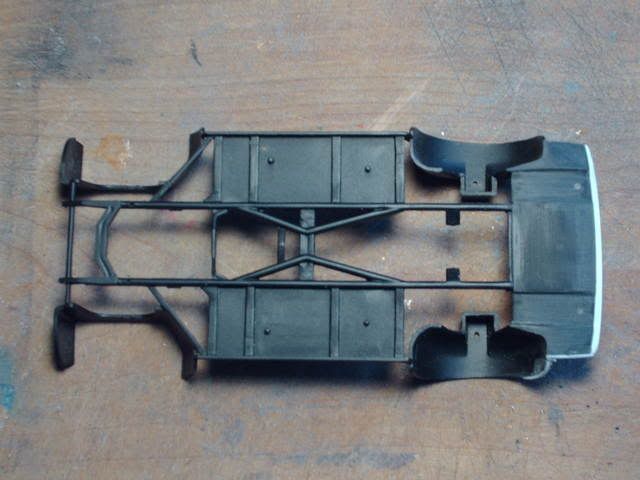 you're off to a good start though. the italeri has pretty bad fit, too. i've been filling and sanding and priming and filling and sanding and priming some more. it makes me appreciate the fit and finish of tamiya kits. i've finally got the 365 body whipped into shape; one or two minor blemishes yet on the chin spoiler, but the body is almost done... ![]() ![]() With the body in good shape, i started the chassis... and the fit was sh!te. there was a big gap between the rear roll pan and the body that needed filling with .010 x .010 styrene and 5-minute epoxy. sorry this photo is blurry: ![]() another shot: ![]() next up: finishing the chassis and starting the suspension bits. |