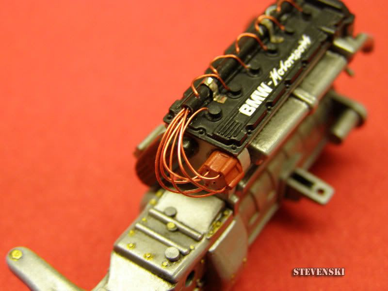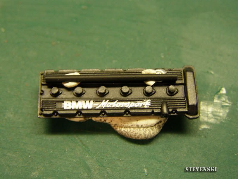 You are right about the BMW logo but there was nothing I could do about it. Anything thin enough to not cover the the logo was too small for the plug wires and anything big enough to let me use regular insulated plug wire was so large it looked out of scale and covered the whole head cover Honestly, I have been f*rting around with this for a week trying different rods, tubes, syringe needles and wires etc. In the end I said 'miiiing****" and did it like this ![]() My reference pictures showed that some cars had this rail on the left, some on the right and others not at all. I wanted to add it felt that covering the roundel was the lesser evil The whole thing needed to be a compromise.