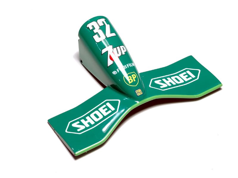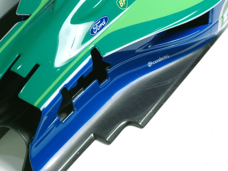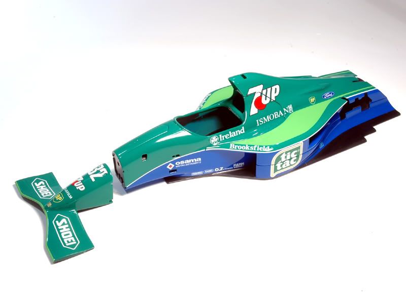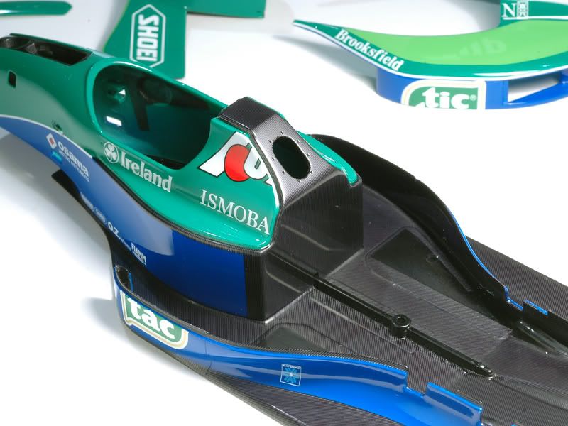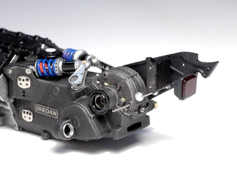 It’s been a while but here finally comes an update. After the last one I simply had no time for modeling for the rest of ’09. Since early January i’ve been working on the Jordan again but this was mostly painting, decaling and polishing which is time consuming and annoying and doesn’t deliver much in the way of progress pictures to show :-) Anyway, here’s what I did: After painting the bodywork colours I masked them off and painted black for the areas that were going to be covered with CF. I then set off for a near endless journey of decaling. I mostly used Crazy Modeler 0124 decals. They are almost identical to SMS 1024, just a bit darker. My reasoning for that was that they might spare me darkening them. During application I learned though that they are nicer and more forgiving to work with than their SMS counterparts ( which I used on the underside of the floor ). They take a lot of abuse and with the help of MicroSol turn rubbery but don’t disintegrate or become too fragile to handle like the SMS ones did for me. Especially for complicated surfaces they are my new weapon of choice. The brake ducts that I will show at a later point wouldn’t have been possible with the SMS decals I have. Anyway this first picture shows the main parts CF’d and shot with one layer of protective 2K-clear: ![]() I tried to lay out the patterns like on the original as far as the reference pictures showed them. It took a lot of time :-) When I was done I realized though, that the CF was way too light compared to the real car, so after the layer of clear I masked the green and blue areas once more and toned the CF down with ZERO “Smoke”. It was the first time I used that stuff and it worked nicely. Unlike the Tamiya smoke which is a bit brownish ( warm grey ) this one is more blueish ( cool grey ) just like Alclad Smoke. It works fine for the Jordan with its blue and green bodywork but might work less well with a Ferrari or Lotus 99T. I’ll have to try that :-) Here’s a shot of the darkened CF on the model next to the bare decal: ![]() The pattern shows well with direct light but appears black from 30cm away or with less light. That’s the effect I wanted to achieve for a realistic appearance. However it did make me feel a bit stupid when I realized how much work I put into first putting all that CF and then almost making the pattern disappear again…..modeling masturbation…:-) The next picture is a whole lot of time later. That’s how the bodywork looks right now after livery decals, several layers of clear and endless sanding and polishing. At the time of applying them i felt like ranting about the inaccuracies of Studio27 decals at this point but I’ll spare you that :-) I ended up using a mix of Tamiya and S27 decals but the combination of them still doesn’t let you build a 100% accurate Spa version. Maybe for others they work. Also, if you build this version forget about the livery guides in the S27 set or the Jordan 191 Perfect manual. They are both wrong… ![]() One pet thing of mine I wanted to get right ( or at least a bit better than on previous builds ) was the paint finish and differences between painted and bare CF areas. There’s room for improvement but I’m starting to be happy about it now :-) I wet sanded the paint with 1200 and 2000 grit sandpaper to even out the surfaces ( and get rid of dust particles…) and then polished with micromesh up to 4000 grit to get a semi gloss surface. On the undertray and monocoque I then masked off the CF areas and carried on polishing and finally waxing all the areas that are in blue or green. I hope you can see the result with different levels of glossiness in the next picture. ![]() The front wing went through the same process. I ended up using a lot more clear than I wanted ( gotta try a different approach on the next model…), which kept me worried about the cowling still fitting in the end. As a safety measure I didn’t paint and decal the inside of the nosecone and the cowling yet. This was going to leave a chance to thin them locally if the fit turned out too tight. In case of the nosecone that proved to be a wise decision. There’s some filing and scraping necessary to make it fit to the monocoque again… ![]() Next up is the underside of the nose. Same process of paint with CF decals darkened. There are some vertical strakes missing that will follow once I install the flaps and endplates. ![]() The monocoque with bare CF areas as per the original. Lots of sanding/polishing and masking… ![]() Besides all the painting, sanding and polishing ( of wich there’s still a lot to come on smaller bits like the wings ) I also worked a bit on small parts which I like better :-) For the rear light I first tried to modify the kit part but soon realized i could just as well scratch it. So I made the body from renshape plus a holder from wire and styrene bits. The glass piece is made from red plexi glass. ![]() After spraying it Jet Black I installed it on the rear wing support. That one and the gear box oil cooler that I already showed were also painted Jet Black. You can also see a turned aluminium piece in front of the cooler that is part of the anti roll bar. To get a somewhat faceted look for the rear light I painted some silver through a mesh on the backside, followed with black which hides a drop of glue that holds the glass piece. ![]() The wing support is mounted to the gearbox housing with Scalehardware hex bolts w/studs. The drill is just to hold it in place as long as some parts are still missing :-) A/N-fittings and hoses for the radiator will also follow later. The rear beam wing has been CF’d, painted and sanded/polished just like the monocoque and undertray. ![]() So that’s it for now. I think I need to play some more with some small bits because I’m fed up with clear coat polishing at the moment but there’s still a good deal of that to come :-( At least so far most parts came out like I wanted the