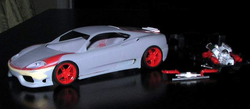 Hey guys, heres the first of my 3 group build projects, a tamiya 360 Modena with the MSM Stradale trans kit. I've had the kit since it first came out and had done a bit off assembly to the motor, but after seeing some of the newer builds I decided to pry it all apart and repaint it with some metalizer. I also am trying out some plasticote fabric/texture paint on the intake plenum and it worked for the most part, but the p/e emblems on the plenum are too buried to sand out(guess i'm gonna buy that nice CM pe emblem set). The sides and front bumper of the t/k have been super glued on, and the front bumper was a bit of a pain because it was very warped(this will require a bit of work to fix where it is attached, but it it stuck there for good!). I'm not sure i'm going to try to replicate the rear grill area, but i'm going to possibly mod the tamiya decklid into the CS version since the one in the MSM kit shrank(i've had this t/k for 2 years so I guess this is common) I've barely gotten started on it but here it is, the wheels are aoshima Auto Couture Supremes with an added lip I casted on the back. Color will be Tour De France Blue, with a red sport interior(seats from an Enzo will be used). Comments and critiques are most welcome...thanks for looking. Please pardon the pics, i've got a great new camera and am learning its settings, plus I now need to get a proper lighting setup for the bench...