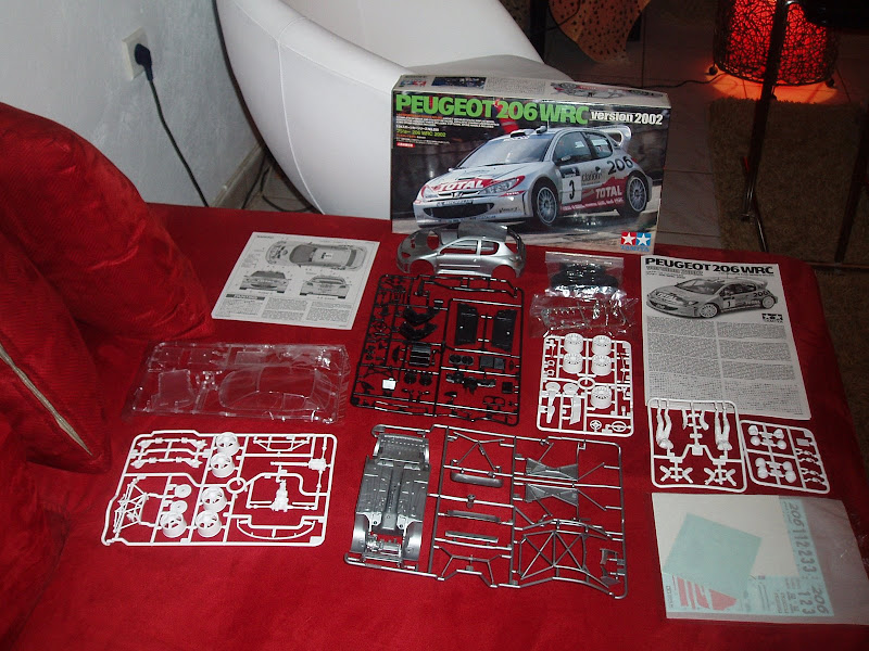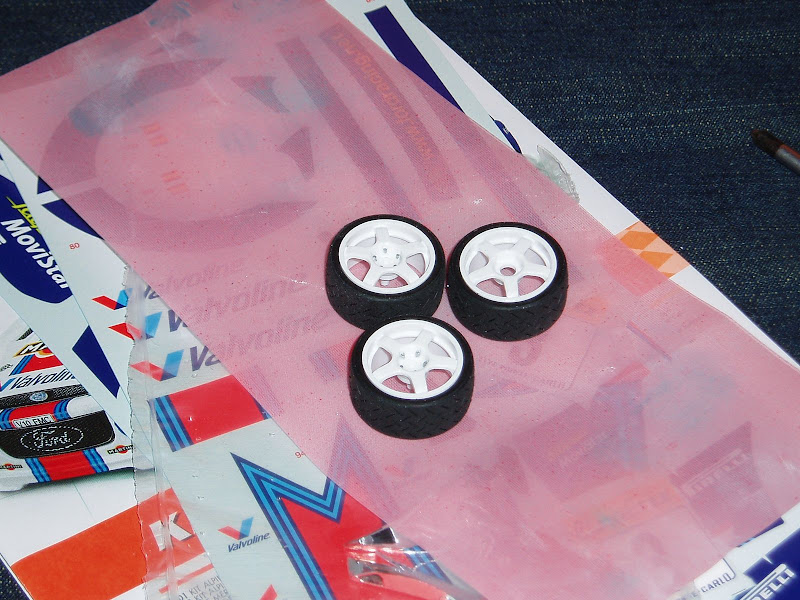 My name is Steve, I just bought a 206 WRC 2002, to join the tribute-build to Richard Burns. It's a "Tour De Cource" version, and I'll also build a rally diorama with this... I'm warning you, this will be a slow project (sorry about that) I don't want to make any changes to the original kit (which I find very good, and in my opinion very accurate - correct me if I'm wrong) I just want to paint it as good as I can, along with some good weathering of cource. Driver and co-driver will (of cource) be put inside - becase of the diorama... So, enough talking... These are the things in the kit: and the first thing I like to try (as I believe most of us do...) is the wheels.. 1st or 2nd I choose the first ones...