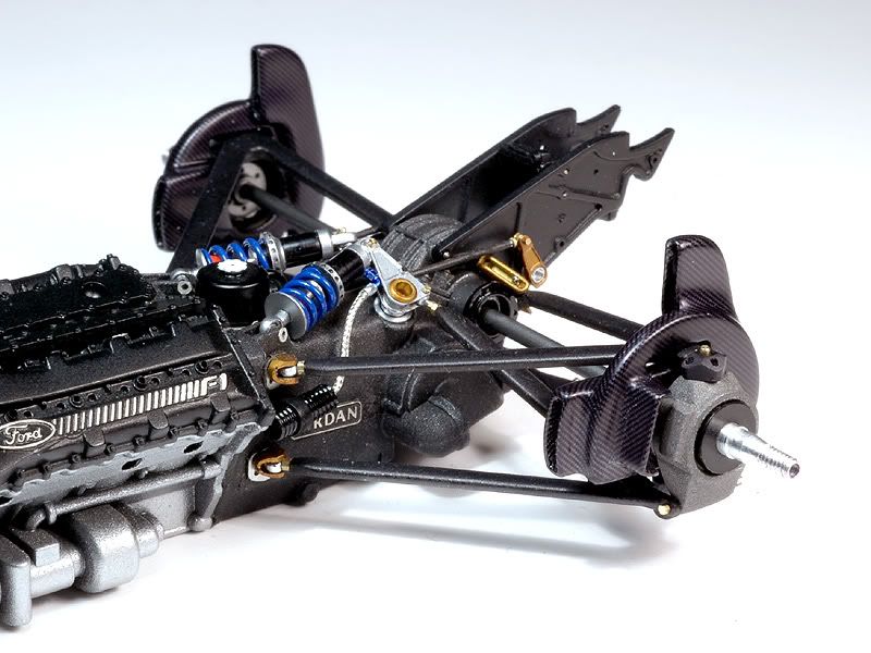 After a somewhat longer break here’s another update. The reason for this was the suspension I started to install. Despite all my efforts I got fitment and alignment troubles. It’s really amazing and frustrating at the same time how much some paint and glue can mess up parts fit. I have to learn to build with bigger tolerances it seems. I got so annoyed and angry about all my efforts to do the build as clean as I can go down the crapper that I decided to put the model away for a bit and do other things, or other it might have come to an untimely end :-) Anyway, I finally got back to it and managed to fix the issues mostly so here we go. For a change after all the cockpit and monocoque stuff I started on the rear suspension. ![]() I started by installing the yellowish/orange looking parts. These were all painted Alclad transparent yellow over a Zero silver base and finished off with a thin layer of matt enamel clear for the anodized look. The little arms of the anti roll bar were connected to the bell cranks with thin painted tubes and rod end details. The arms should be vertical as per the real ones, but in that position they would have collided with the cowling… Next I installed the rear damper reservoirs and connected them to the dampers with ProTech braided line ( very nice stuff ) and R.B.Motion A/N-Fittings. ![]() Then I could start with the lower suspension arms and pushrods. The Jordan 191 usually gets the credit of being the first F1 car to use CF pushrods. However, when I wanted to put CF decals on the pushrods and started checking reference pictures for the pattern orientation I was surprised to not find any picture of the rear pushrods in CF. It turns out it wasn’t used on the rear ones as the resins of the time couldn’t stand the heat from the exhaust. That sent me into more checking. I only found one useful picture of the front pushrods at Spa in the F1Modeling Schumacher Special but it shows that he didn’t have CF ones! I guess ol’ Eddie Jordan was afraid that stupid pay driver kid might break his costly pushrods and left them off :-) Anyway, as a result I left the CF decals off and painted all the suspension arms with a mix of Jet Black and some Alclad steel for a hint of metallic sparkle, followed by some matt clear to take off the shine. Below these layers I first put on some paint dots to replicate what I guess are spot welding points. These are visible in all the pictures. ![]() Then I installed the uprights with the brakeducts already glued on, followed by the driveshafts and upper suspension arms. It was quite tricky because there were a lot of ends coming together at the same time and at this point the fitment issues really started… Anyway, for the record, the uprights are painted in a mix of matt enamel black and aluminium because enamel paint can give a rougher ( cast metal ) look than Zero when airbrushed at high pressure. The brakeducts received the same CF treatment that I previously described and were sanded and lightly polished ( and yes, it took ages to do them but I’m pretty proud about how they turned out :-) The driveshafts are painted Alclad Magnesium over a black base. ![]() Here’s a view of all parts assembled from the top rear. You can see that despite my efforts around the rear wing support things are not perfectly aligned but once the rear wing is in place this will be less visible :-) ![]() Another view of one of the brake ducts. The CF pattern orientation is true to the real one :-) ![]() And finally a view from the rear. ![]() Now I have to get to the front suspension…there are more issues to fix! CU again for that :-) |