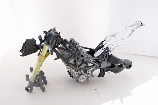 better shot of the chassis with bare engine in place. front forks not quite finished yet as the calipers and that while section that holds the wheel still needs to be fixed detail wise and painted. engine block has had bolts picked out in a dark gold. the two parts of the swing arm has been glued together, seem fixed and painted along with the suspension parts. the control rod(?) is now a separate part but the shock itself I left molded onto the part. what it all looks like together. and as suspected, it is all pretty much hidden and will be even more so when the wheel is in place. and that's it for the major parts. got a bit of carbon decalling to do before I tackle the wiring and plumbing of the thing from whatever I can decipher from the service manuals.
