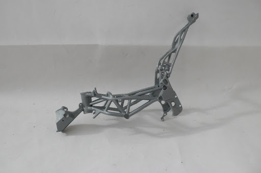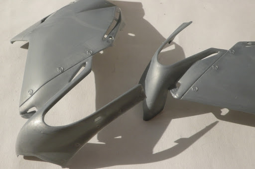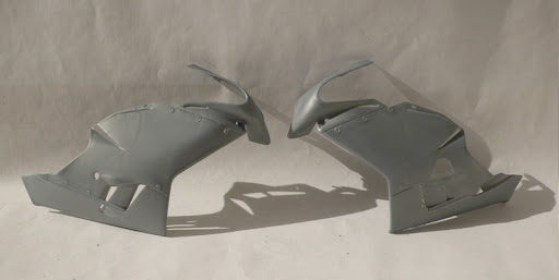 Italeri MV Agusta F4 (750) 2004 Special Parts. This kit is a rebox of the original Protar Swift Kit of the MV Agusta F4 750 but with a different decal set and some slightly different parts to represent a later special edition of the bike. This being a Swift Kit, it doesn't come with the nice-ish seperate linked chain or the working rear suspension but I'll deal with that later. First things first. Main cowl. Not bad looking but horrible and quite typical Protar locating for the join i.e bad... There were also a few sink holes to deal with And the molded on pins that hold on the panels will need to removed and replaced. This is the rear shock assembly. and in place in the rear swing arm. I know that on the original High Quality kit, this came as a multi-part assembly but without that at hand I'll have to seperate the pieces myself and work in a moving solution later. That would also let me get rid of the join line that should be there on the inner face of the swingarm. Chassis frame. A not bad representation of the tube frame. It's not 100% but I've heard that some of the Swift Kits had horribly simplified chassis so I'm glad this isn't too bad. Here, I've already fixed the two halves together. Luckily, there's enough flex in the frame to allow me to squeeze in parts afterwards. The engine. Again, typical of a Protar kit of this period in that there is detail but it all a bit soft and oversized. Some main bolts are molded as a big lump that needed to carved out and some of the lines were deepend/redefined with a fresh blade tip before primer. ...and because once I opened the box I couldn't keep my hands out of it, I prepped, primed and painted the body panels. As you can see, I removed the left hand side panel so you can display it that way. The molded on pins were removed and drilled out so I'll have to make some new better looking pins of my own to hold the panel in place when complete. The blue stripes are included in kit as decals but they don;t match the blue I was going to use so I used them to make positive masks for when I sprayed the silver. I then made negative masks and sprayed the blue. Paints are: Silver = Hycote Double Acrylic Ford Strato Silver Blue = Tamiya TS-50 Mica Blue There is also a bit of an error between the seat and upper seat cushion. I wrongly assumed that the seat would cover up that little bit of body work so left it unmasked. Alas, I'll have to carefully sand that blue out and possible touch up with some more silver. Finally for now, a quick mock up of some parts.