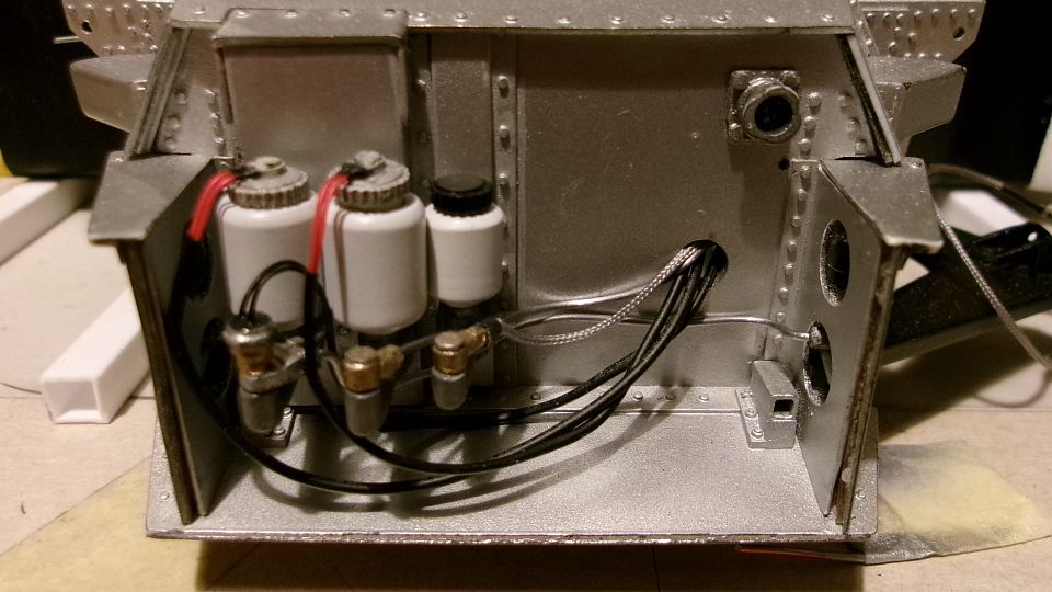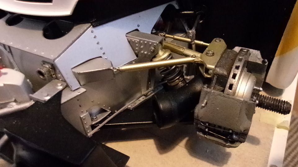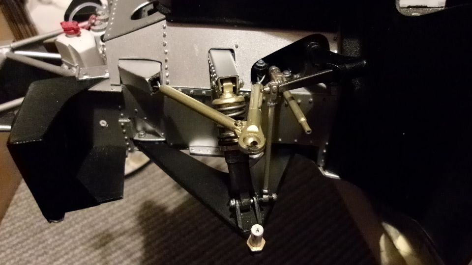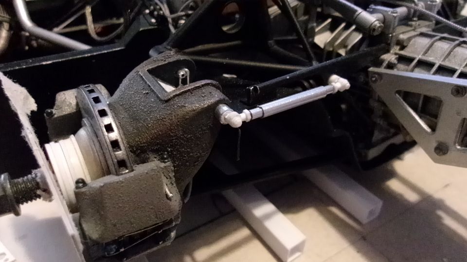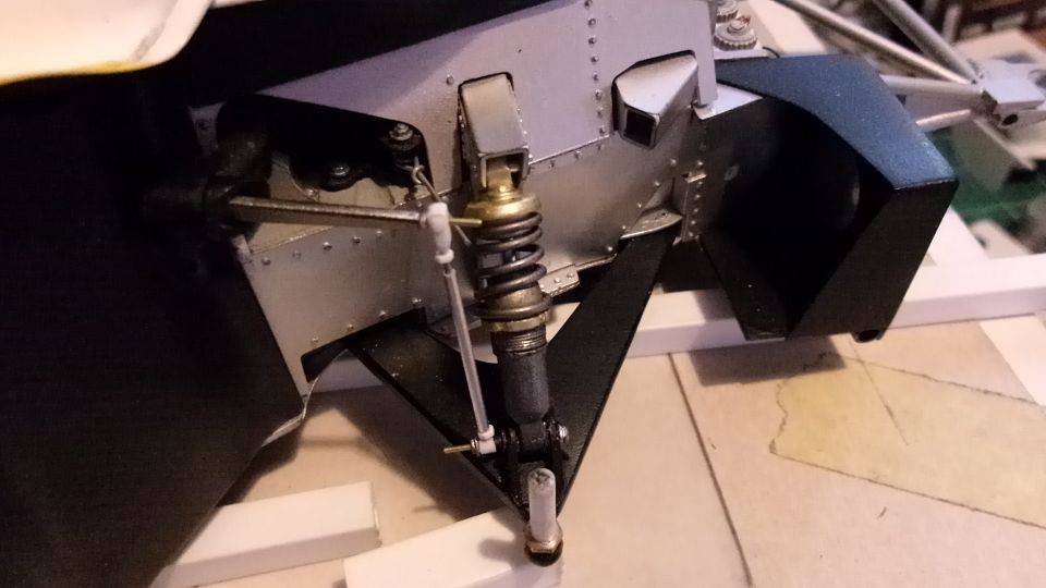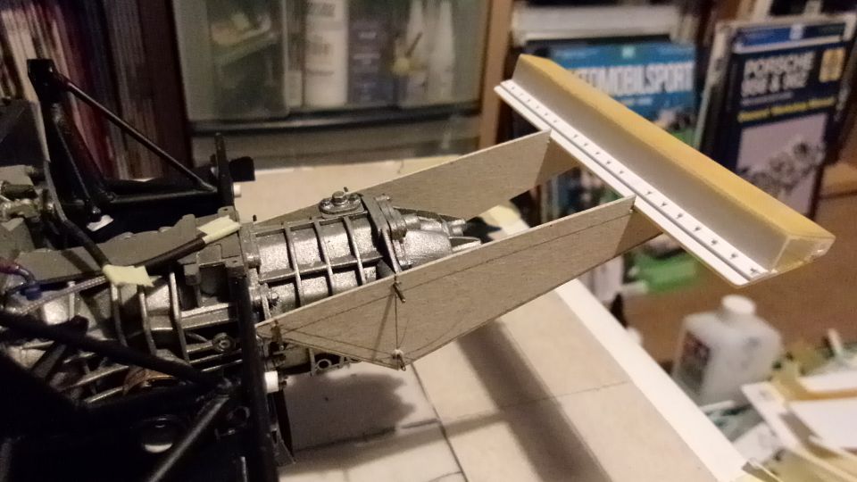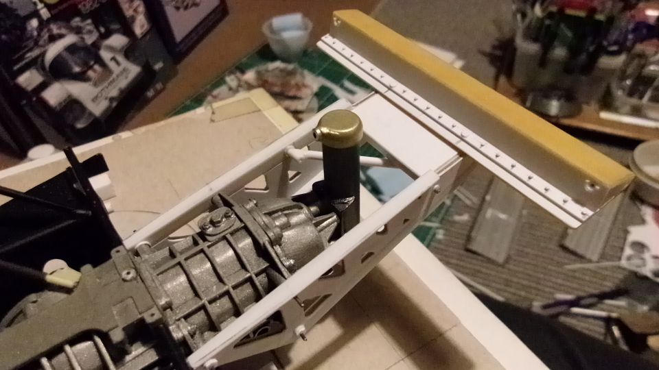 November was basically a month of slowly adding parts to the engine bay, tidying up some of the details and working towards getting the bellhousing and gearbox fitted. With the exhausts and turbos already in place I added the wastegates, control hoselines, and the heatshields with support stays: ![]() The wastegates intrude into the ducting on the underside of the engine cover bodywork, so these have been trimmed out to clear. Before fitting the heatshields I added a little filler to the exhaust pipe joints and touched-in the paintwork - same with the tailpipes . The only delay in final-fitting of the bellhousing was adding the forward mounting for the lower wishbones and making sure that the holes in the undertray gave sufficient clearance for the wishbone legs. With the bellhousing in place, I added the oil tank, diagonal stay, and the oil catch-tank: ![]() ...adding some of the pipework to the oil tank, coil wiring, and the main part of the gear-linkage: ![]() After all this, it was time to fit the intercoolers and the solid pipes down to the water pumps: ![]() I had to do a little adjustment to the pipework between the intercooler units and the turbos - it's inevitable that parts will move around slightly during assembly! Having most of the parts magnetised was certainly a big help in this process, allowing quick and easy fitting and removal and also a little flexibility in positioning. The intercoolers themselves are only glued in place via the pipe connections - the main mounting is just the magnets onto the side support frames. I had a break from work in the second half of November, and this was an opportunity to spend some time finishing the assembly of the back end. Before I mounted the gearbox I opened-up the undertray holes for the rear legs of the wishbones, and checked that the wishbones could still be fitted afterwards - they can. The main job during this period was to work on the support frame from the gearbox to the back edge of the tail. With the gearbox position finalised I could work out the correct angle for the side plates and set the height for the crossbeam: ![]() In real-life the sideplates are a folded Z-section, but I knew I would be unable to replicate this properly purely in styrene, and was unwilling to tackle it with aluminium. Although the tail itself is actually quite well-balanced, I knew that the support frame would have to be capable of taking some loading. For a short while I considered making the structure as a pair of small-diameter tube-frames, but bypassed this and settled on using a fibreglass and styrene sandwich, with styrene angle sections along the top and bottom to create the Z-profile: ![]() The holes for the lattice-frames took forever to drill-out and file to shape! I've made them a little 'chunkier' than they should be to improve their strength - I'd rather do this than risk them breaking or cracking. The crossbeam is a styrene / fibreglass hybrid with more rivet detailing, and slots neatly into the channel in the back of the tail bodywork. I've fitted the rear airjack temporarily to make sure the little diagonal stay clears. There's still scope for final adjustment of the crossbeam position when I fit everything together. It sounds daft, but making these pieces took the best part of a week's work! Adding the gearbox has meant the rear top wishbones are now in place, so final assembly of the suspension is imminent. That's what I've been working towards during the last couple of weeks. The rear uprights are basically ready to fit, but I've finally made the connecting pieces for the flexible brake ducting: ![]() Another job has been finishing the rear dampers and making the springs. I've glued the spring platform collars into position, and added some small-diameter wire coils to give the appearance of the external threads on the damper bodies. The springs are made from 1.2mm plastic-coated wire - the real ones are dual-rate with a tapering shape, but I've settled for winding them around two diameters of tube to get the shape: ![]() Since taking these photos I've airbrushed the dampers and the tail support frame, so you'll see these on the car when I do my usual New Year's Eve update. I've also been finalising the rear roll-bar parts in preparation for assembly, making attachment pins for the dampers, and generally just getting everything ready ahead of the coming weekend. I want to take the 956 into the workshop next week, so my colleagues will be able to see what I've been up to during the year! That's it for tonight. I'll do an update at the end of month, so have a good Christmas! SB |