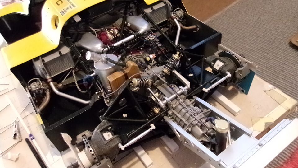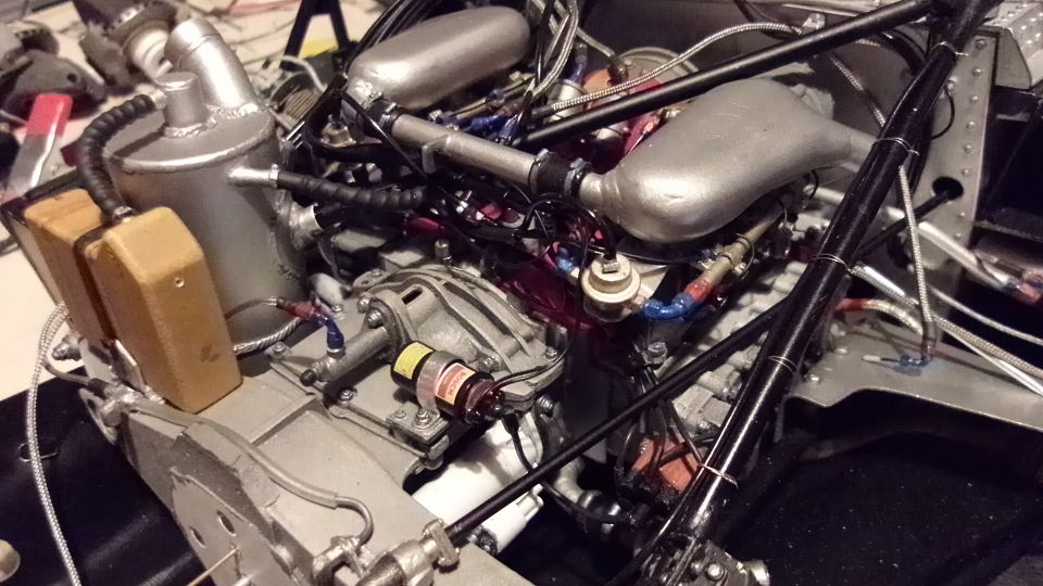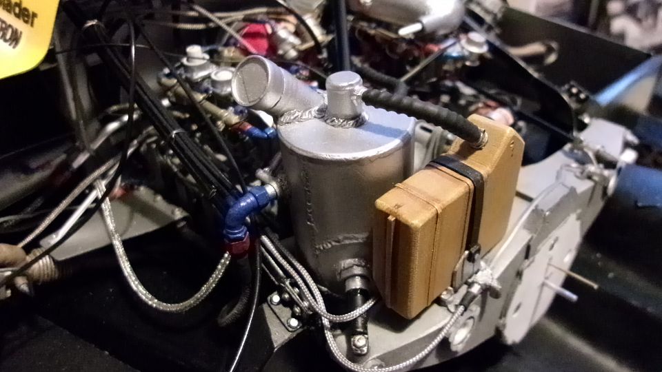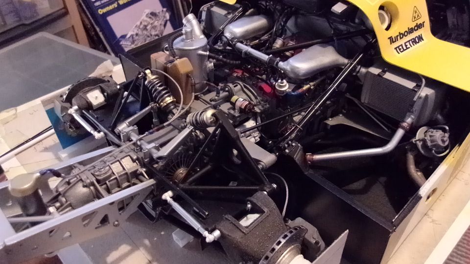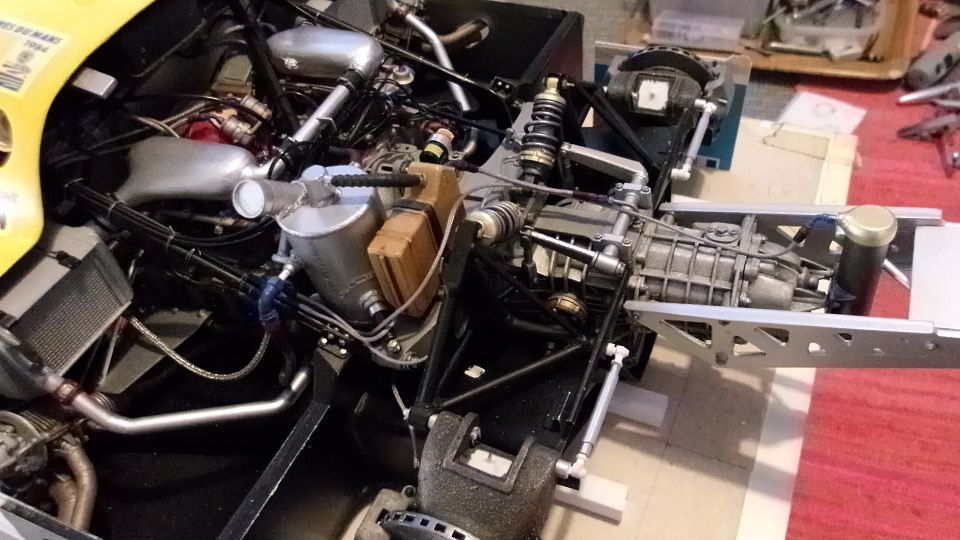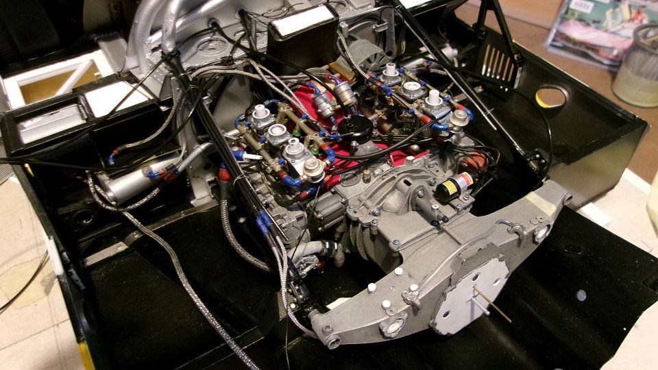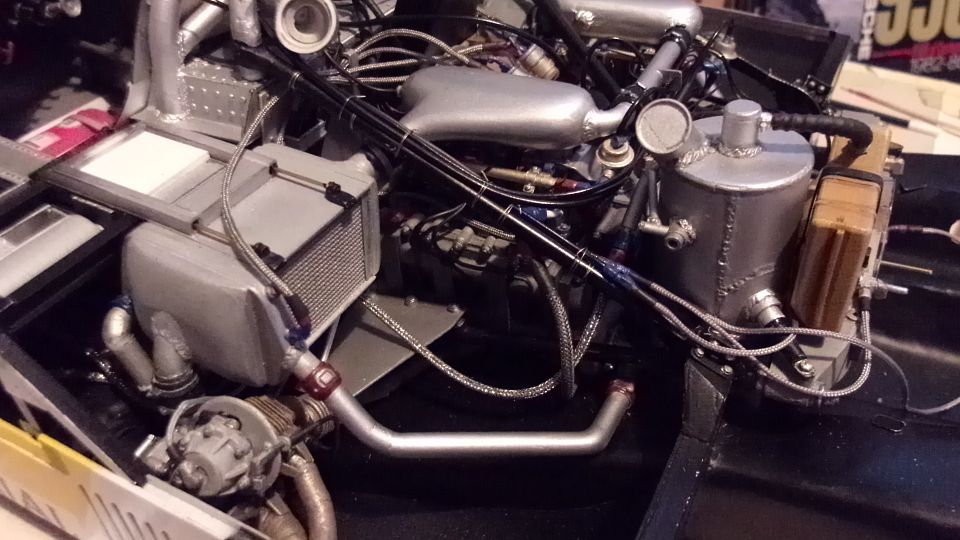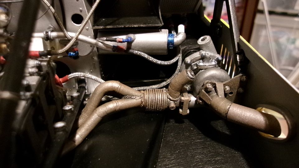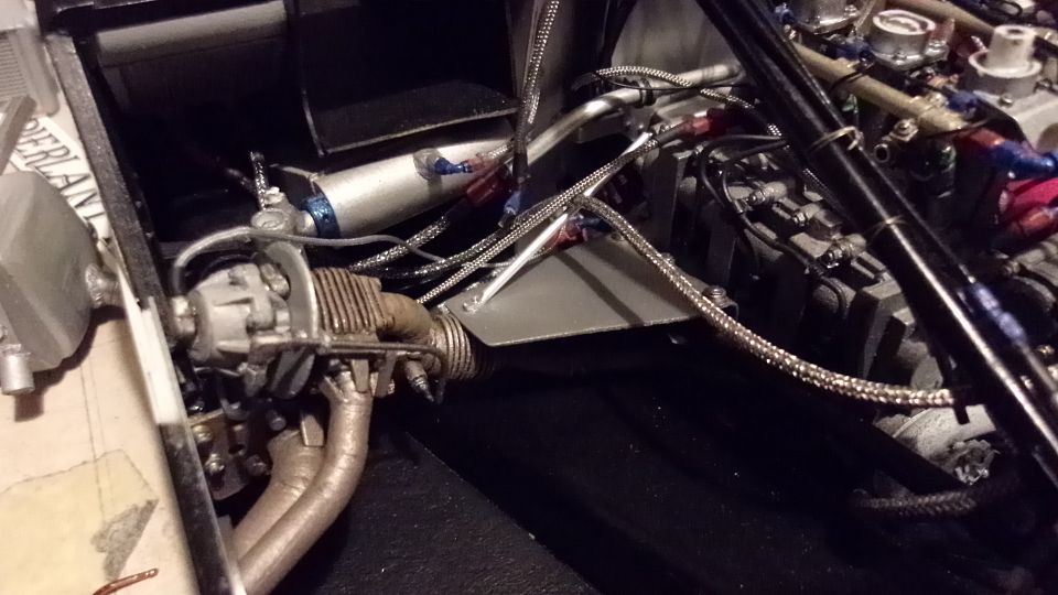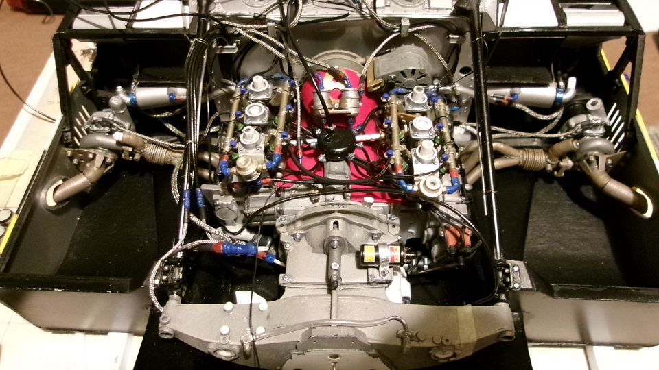 Okay, so my plan to get the tail finished in paint by the end of September didn't quite work out. Although I did return to it at the end of the month, it's not ready for varnishing or decals yet, and I'll probably now leave it alone for the winter...probably. The issue with the masking tape leaving an impression threw me off a bit, as it hadn't been an issue before. Perhaps it was a consequence of spraying in the cooler temperatures? However, work has been progressing in other areas. Here's the mirrors I mentioned last time - still unpainted when this photo was taken, but with mounting brackets, stalks, etc: ![]() I spent some time painting and detailing the master cylinders, getting them fitted to the front bulkhead, and threading the pipework through into the tub: ![]() A lot of time in recent weeks has been spent on trying to organise the mass of pipework and wiring in the engine bay, prior to fitting the engine. I've also put together braided lines for the oil cooler, the rear brake line running across the top of the bellhousing adaptor, the gearbox breather, etc: ![]() ![]() By early October I decided there wasn't much point in delaying, so the engine was finally fitted: ![]() I added some lead-wire detailing around the top of the engine bay and A-frames to create the fire extinguisher pipework, and have secured more of the wiring to the top A-frame tubes. You can see a couple of the blue connectors on the left-hand side leading to braided hose - one of these is the brakeline and the other the clutch. It's been slow-going as there's so much going on back there - there's been a lot of checking, cross-checking, finding notes I made months ago, etc! The bellhousing adaptor isn't finalised yet - I'm hoping to get this fitted in the next couple of weeks, but I need to do some work with the rear suspension first. With the engine in, the focus for the last week or so has been to get the turbos and exhaust pipes fitted, and prepare the intercoolers and pipework. I've had to do a little adjustment on some of the connections, but overall both sides went in with little fuss. Here's the right-hand side: ![]() The exhaust pipes clicked into place under the engine thanks to the magnets, and were glued to the rest of the turbo assembly, then the gaps filled and re-painted. Oil feed lines have been added and attached to the engine, and I've started making some more lines for the turbo control. Part of the pipework to connect the radiator to the intercooler is in place, with the blue locking collar. Overall, the engine bay now looks like this: ![]() Next job is to get the turbo wastegates fitted, add some more pipework, and apply some filler to the joints on the exhaust tailpipes. Once that's all done, it'll be time to fit the intercoolers and push on with the bellhousing and gearbox...and lots of other things! More next time, SB |