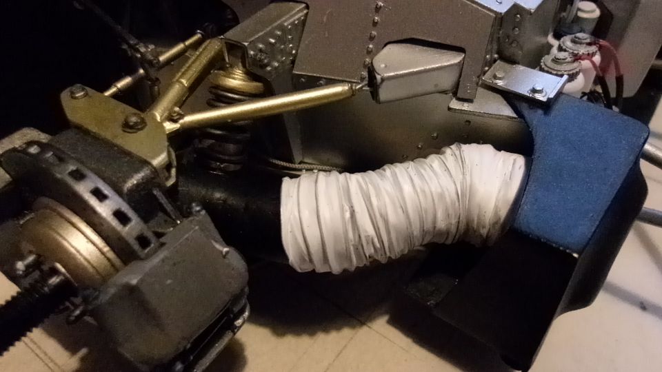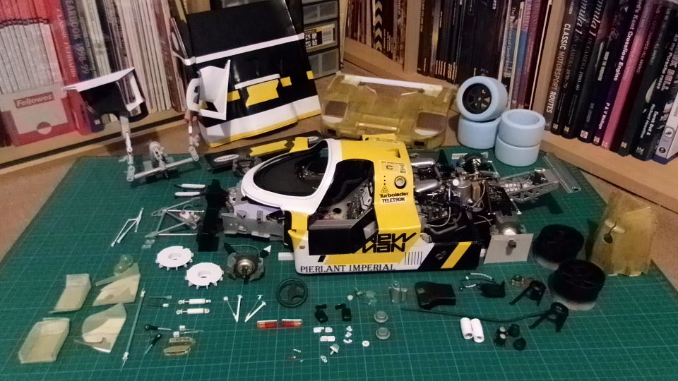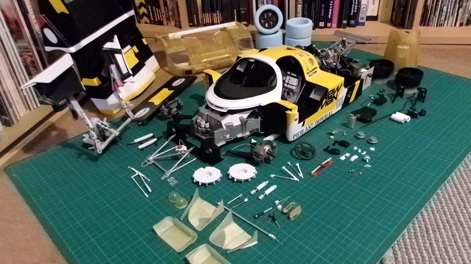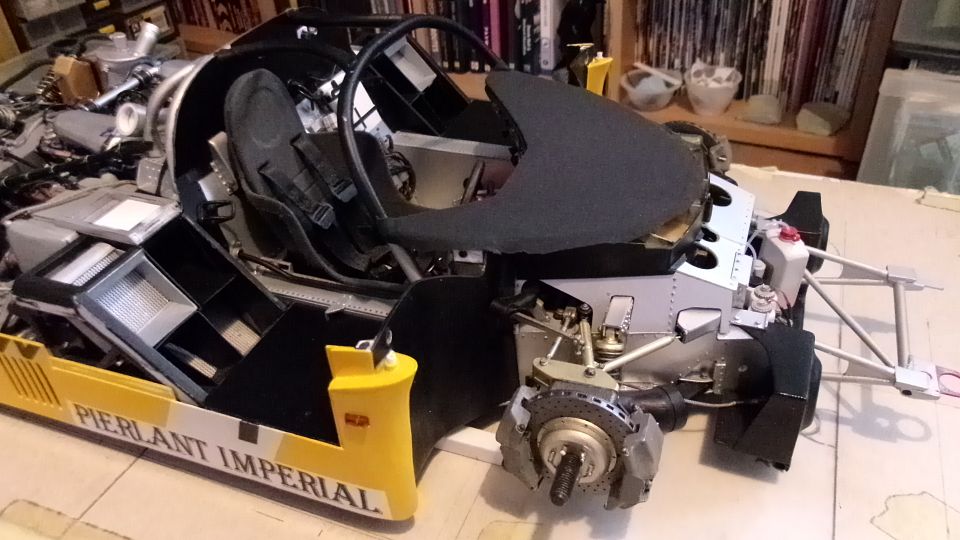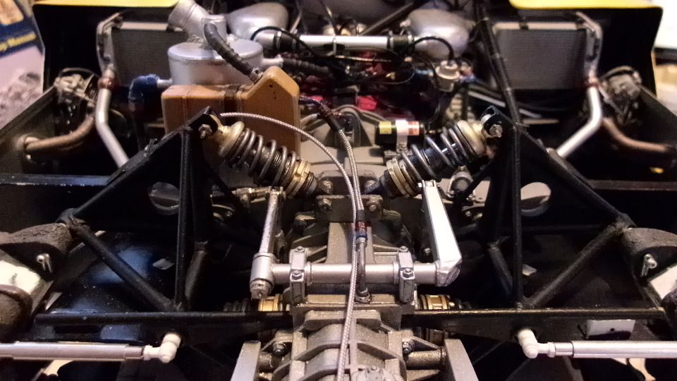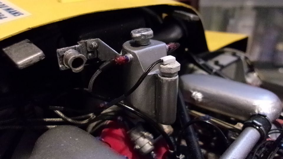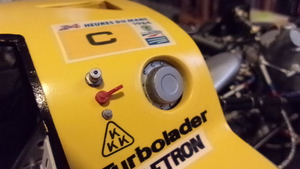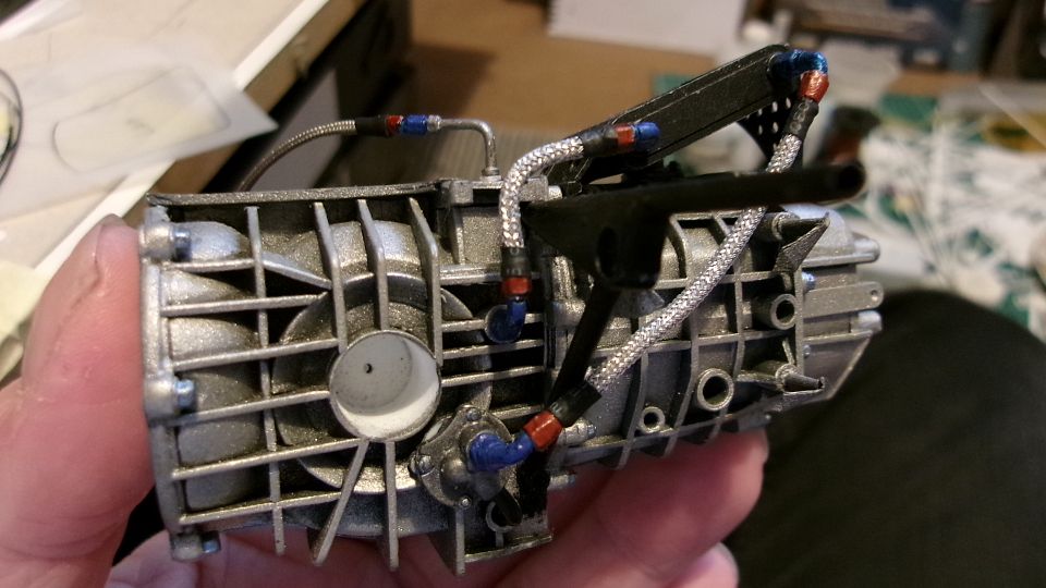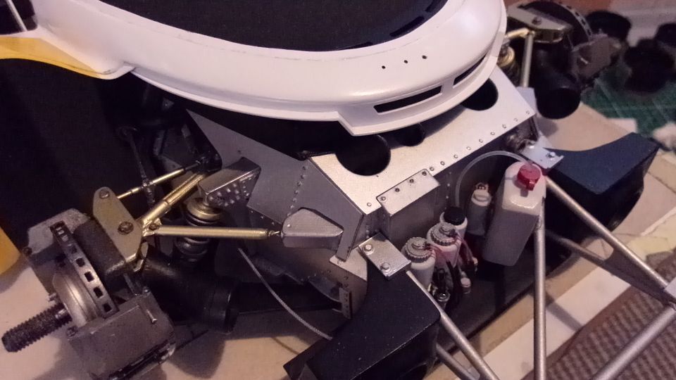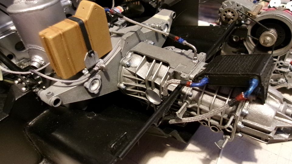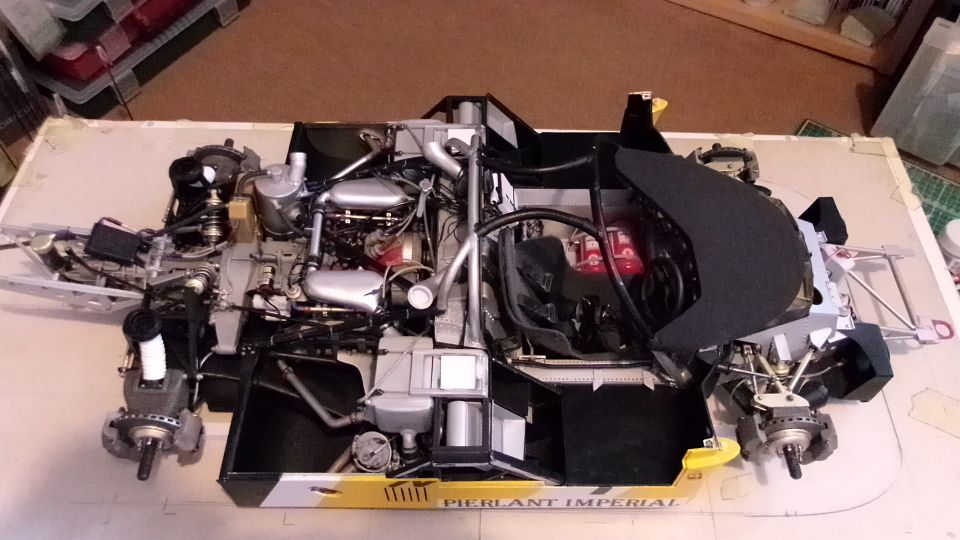 Okay, so my plan to get the tail finished in paint by the end of September didn't quite work out. Although I did return to it at the end of the month, it's not ready for varnishing or decals yet, and I'll probably now leave it alone for the winter...probably. The issue with the masking tape leaving an impression threw me off a bit, as it hadn't been an issue before. Perhaps it was a consequence of spraying in the cooler temperatures? However, work has been progressing in other areas. Here's the mirrors I mentioned last time - still unpainted when this photo was taken, but with mounting brackets, stalks, etc: ![]() I spent some time painting and detailing the master cylinders, getting them fitted to the front bulkhead, and threading the pipework through into the tub: ![]() A lot of time in recent weeks has been spent on trying to organise the mass of pipework and wiring in the engine bay, prior to fitting the engine. I've also put together braided lines for the oil cooler, the rear brake line running across the top of the bellhousing adaptor, the gearbox breather, etc: ![]() ![]() By early October I decided there wasn't much point in delaying, so the engine was finally fitted: ![]() I added some lead-wire detailing around the top of the engine bay and A-frames to create the fire extinguisher pipework, and have secured more of the wiring to the top A-frame tubes. You can see a couple of the blue connectors on the left-hand side leading to braided hose - one of these is the brakeline and the other the clutch. It's been slow-going as there's so much going on back there - there's been a lot of checking, cross-checking, finding notes I made months ago, etc! The bellhousing adaptor isn't finalised yet - I'm hoping to get this fitted in the next couple of weeks, but I need to do some work with the rear suspension first. With the engine in, the focus for the last week or so has been to get the turbos and exhaust pipes fitted, and prepare the intercoolers and pipework. I've had to do a little adjustment on some of the connections, but overall both sides went in with little fuss. Here's the right-hand side: ![]() The exhaust pipes clicked into place under the engine thanks to the magnets, and were glued to the rest of the turbo assembly, then the gaps filled and re-painted. Oil feed lines have been added and attached to the engine, and I've started making some more lines for the turbo control. Part of the pipework to connect the radiator to the intercooler is in place, with the blue locking collar. Overall, the engine bay now looks like this: ![]() Next job is to get the turbo wastegates fitted, add some more pipework, and apply some filler to the joints on the exhaust tailpipes. Once that's all done, it'll be time to fit the intercoolers and push on with the bellhousing and gearbox...and lots of other things! More next time, SB |