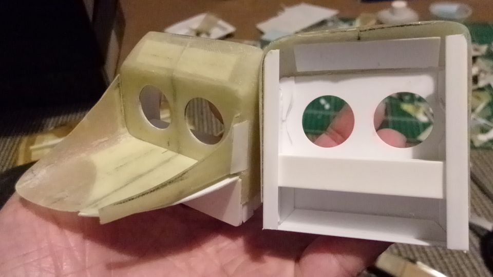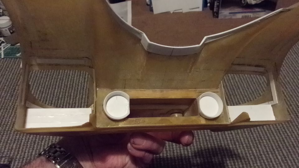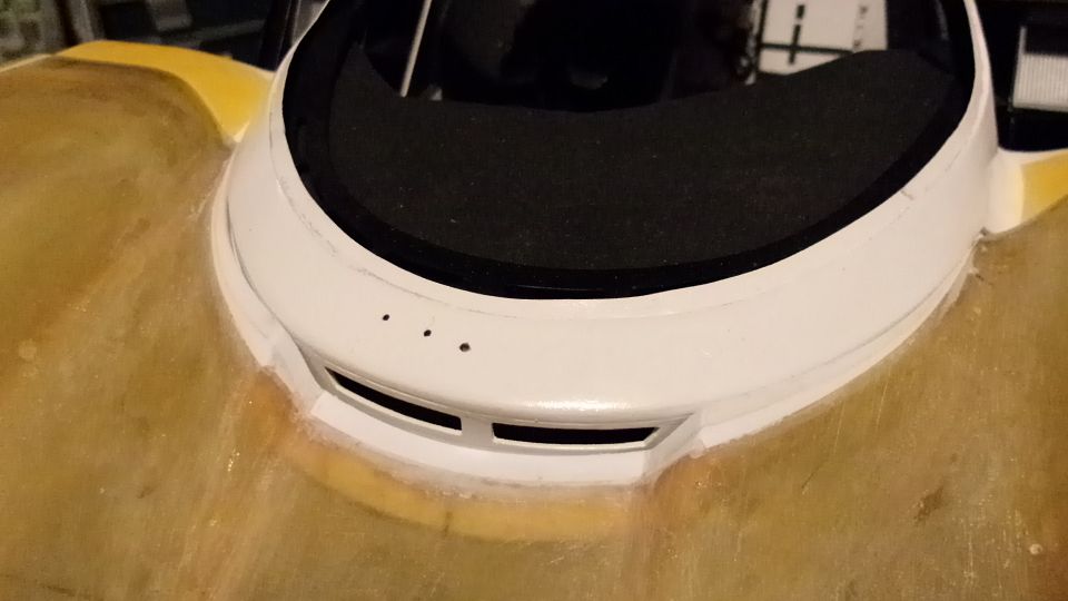 Hello again! Apologies - I wasn't planning for it to be March before doing my first update of the year. January and February flew by, and as is often the case with me I kept thinking 'I'll do a bit more then do an update', and then something else developed, I made some more progress, etc, and it was put off again. However, I'm at a stage now where this update will set things up for the final push to the finish. So, I went into January continuing with the headlight pods, adding a vertical section made from fibreglass, with some styrene reinforcement added behind: ![]() I wanted to make each pod quite robust, given that each one will have to trap the headlight cover panel in place. I'm not planning to put any glue 'inside' the pod during fitting, as I don't want to risk any fogging of the either the headlight lenses or the cover panels. This has made me think about the whole assembly process and how I've made some of the detail parts. For the headlights themselves I've re-used the bowls from the 935, so I quickly laid-up four of those in fibreglass. The lenses would be another experiment in vacuum-forming - I made some patterns by stacking a bunch of styrene discs, adding some curvature, then adding some strip styrene to create the lens detail: ![]() ![]() I lined the headlight bowls with kitchen foil to get a bit more 'shine'. The bulb elements are designed so that they can be fitted in from behind, allowing the headlight pod to ventilate during the fitting process. I've glued thin styrene rings to each of the lenses (and to the headlight bowls) so that I don't have to use CA glue for the final fit - maybe PVA? There's also a small indicator repeater light added to each pod: ![]() So that was what I was mainly doing in January. Moving into February, I finished and painted the two rear toe-links, and these are now fitted to the car. I also did a bit of tidying of some of the brake lines, etc, but I'll leave the photos of that for later on. ![]() The main job in recent weeks has been working on getting the nose fitting properly. With the headlight pods now limiting the space available for the brake duct structure on the front of the tub, it soon became clear that I would have to make some modifications! I wanted to both reduce the overall width of this piece and to move the duct inlets closer together, so the only option was to remake the upper half: ![]() The mounting plate was retained and shortened about 3mm each side, the new duct inlets were added, and the original top caps and ends were re-fitted. The Mk2 version is a little more compact, but now fits neatly between the headlight pods: ![]() ![]() While all this was going on I also spent some time playing with the front suspension. Having finalised the duct inlets, I could do some more fettling of the trumpets that would attach to the front uprights. Making the flexible ducts themselves was a frustrating exercise - after several attempts with the wire and plumbing tape I gave up! Which is odd, given that I've made other flexibles with this method with no problems, but these two were definitely putting up a fight; I'll have another go later. Front dampers have been painted, with springs added, and I've made a bunch of pins with hex detailing for the mountings. Front roll-bar links have been made from ali tube with styrene end detailing. Adding the uprights and the top links and trackrods will be a job for the next few weeks, but when complete I'll be able to get all four wheels and tyres set to the correct overall widths and offsets. Getting the nose to fit properly has been...challenging! I've added two aluminium pins to the rear corners - these fit into matching holes in the front of the cockpit panel and combine with the towing eye on the noseframe to keep the panel in position. I had to chop out a small section of the underside of the nose as it was proving impossible to articulate the panel over and around the duct structure with the car at ride-height - now the nose fits 'straight-on' as you would expect. Of course, having done all this I then found that the back edge of the nose was not matching up with the cockpit section as well as I wanted, so I extended this with styrene and re-shaped to suit: ![]() ![]() You can see in this last photo where I've added the styrene backing to the underside of the panel, for the edge extension. I've also added the two 'cups' in the middle which fit over the inlet ducts on the front of the tub. The end result of all this is: ![]() The nose fits as well as it's going to fit, so the plan now is to get some primer on it, get it rubbed-down and see how it looks, then start the airbrushing. It'll need a little fettling where the front edge of the doors articulate, but I can do that before the final coat of primer goes on. Once it's sprayed white I intend to leave it for maybe three weeks before masking it up and adding the yellow, so maybe around the Easter weekend? Then it's back to varnishing, adding decals, etc, before adding the headlight pods and final detailing, so it's certainly going to be into May before the nose is complete. We're getting there...! All the best, SB |