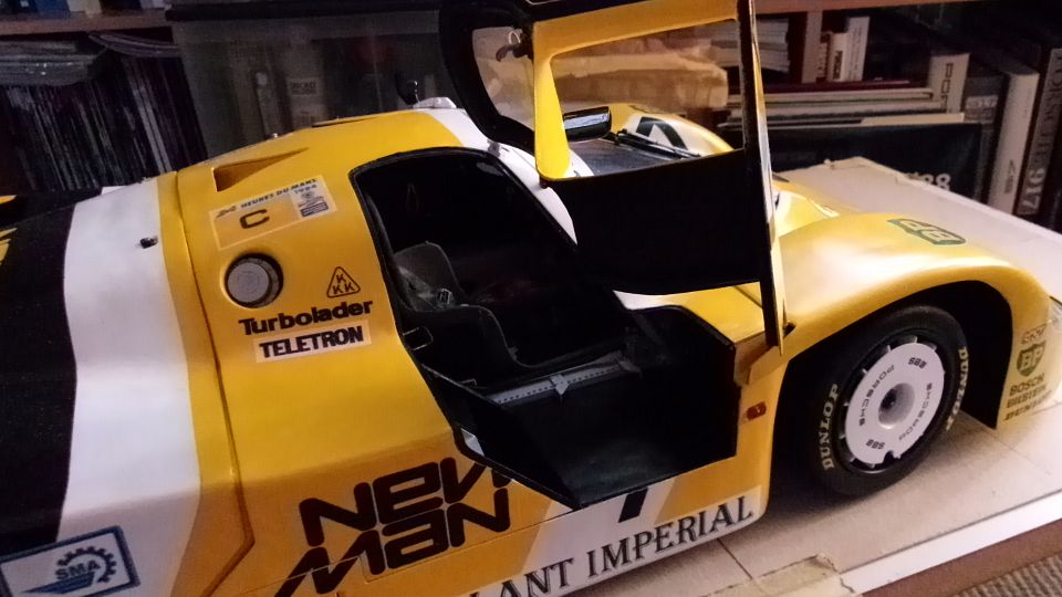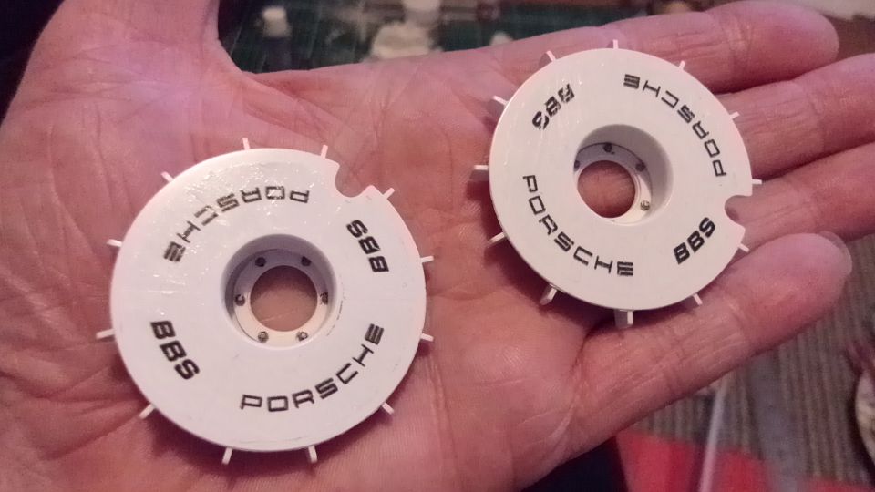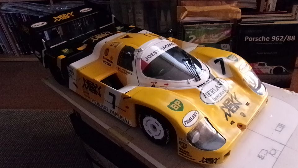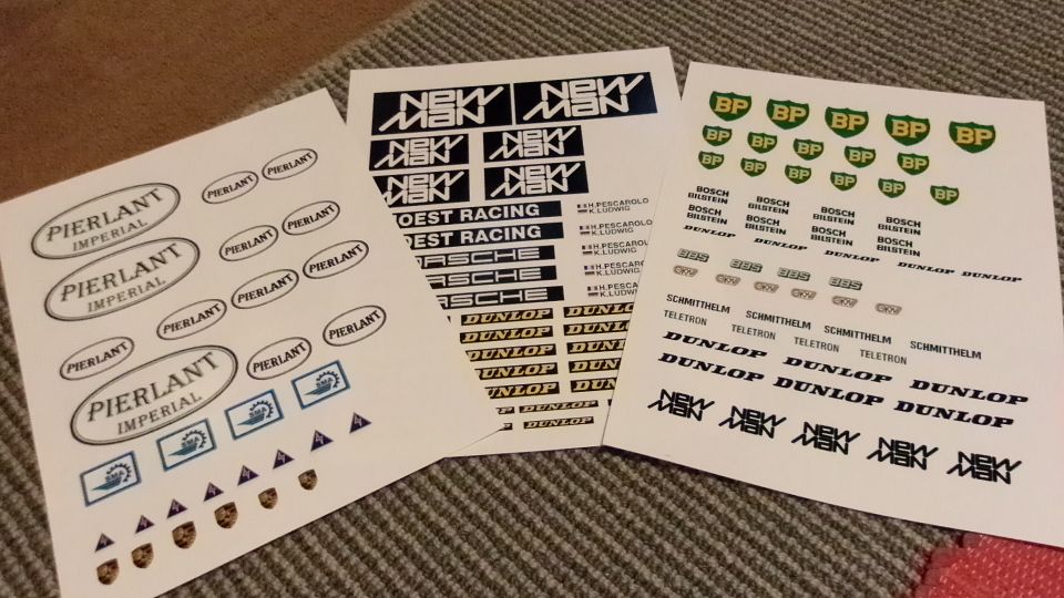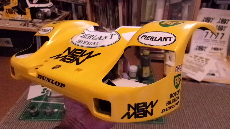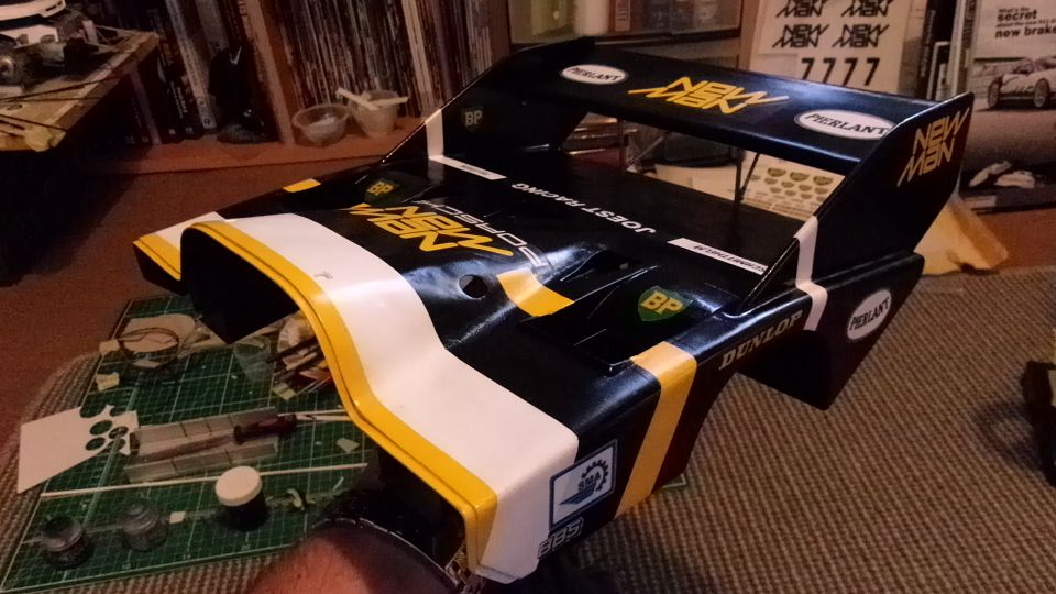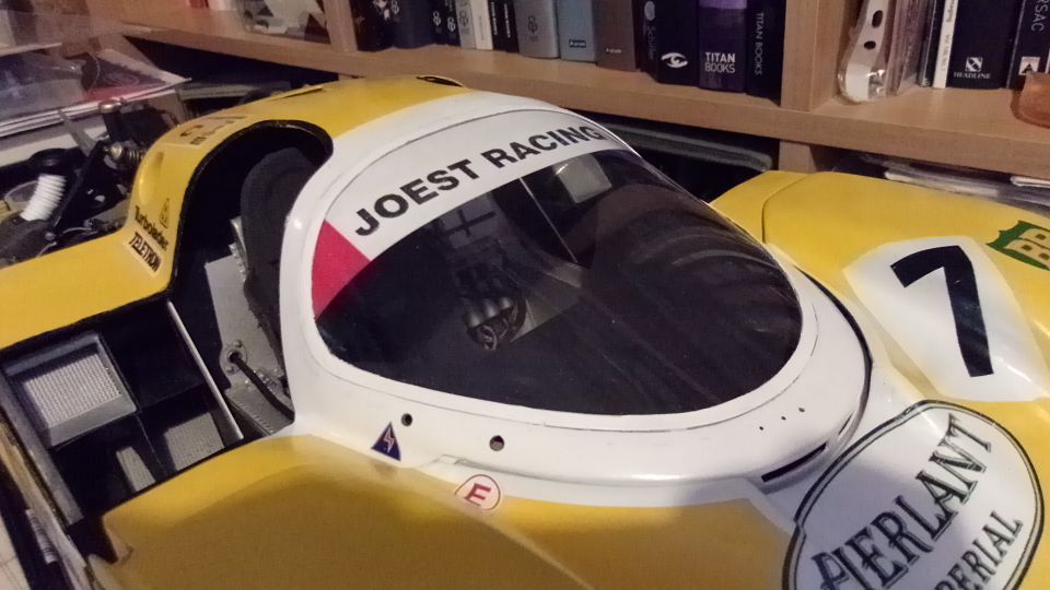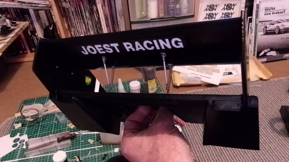 Soon after the last update the nose panel was given a final rub-down, then some grey primer, then the underside was blacked: ![]() After that, more rubbing-down of the top surface, then a couple of coats of Tamiya X-2 white: ![]() This is now ready to be masked-off and sprayed yellow; I'll get on with this from Thursday over the Easter weekend. The second half of March was spent on final assembly of the front suspension and the noseframe parts. As usual, despite having all the main parts painted and ready to fit, you then find you need to make a bunch of little spacers or nut details, or small pins to put it all together, so it all takes much longer than planned! There's also the 'point of no return' element which leads to much checking, fettling, re-fitting, and re-checking before finally adding glue. Anyway, here's the upper wishbones added, plus the roll-bar link and trackrod: ![]() ...and then the upright, complete with brake duct and aeroquip line: ![]() While all this was going on, I also added the fibreglass ducting section for the brake cooling inlets, then the noseframe with wash-bottle: ![]() The steering trackrods were re-made a couple of times during all of this - I wasn't happy with the size of the wire-wrapped 'rod end joints' I'd made, as they were too long relative to the trackrods. So I remade them in a shorter spec, then increased the lengths of the trackrods - much better. I didn't finalise the length until I'd got the uprights fitted, then I could perform a 1:8 scale 'set-up' of the geometry and get the wheels pointing in the right direction! Just a little bit of toe-in... With the suspension finalised at all four corners I then did some work on finalising the wheel spacers required to get the final tyre position just-so. These have been made, painted, and are ready to add when I do the final assembly of the wheels. The four tyres have been painted, sealed, and are ready to have some Dunlop decals added at the weekend - then I can give them a final varnish, and assemble the lot. Photos next time. The last week or so has been spent creating the decal sheets for the nose and tail - I'd been putting this job off, but realised that if I wanted to spend some time over Easter getting some of them in place, I needed to get busy! Some of the logos were already scanned and just needed to re-sized for the new positions, some were taken from the main 1/24 kit sheet then cleaned up to suit, and some were already 'on file' from the 935/78 build. End result, one page printed onto white paper (Pierlant logos, etc) and two pages on clear: ![]() These were printed on Saturday, and the plan is to give them two coats of Liquid Decal Film tomorrow and Thursday night, ready for application at the weekend. The tail bodywork was given a final Micromesh rub-down on Sunday, and has had a spray of Mr Hobby Topcoat, so it's ready to go. Final job at the weekend was to get the windscreen drilled, pinned and ready to fit. The top section has had a spray of Topcoat, so this is another job lined-up for the next few days. I realise I also have to add a 'Joest Racing' sunstrip across the top - this won't necessarily be a decal, but I'll work that out! It'll be easier to do this now the screen can be pinned in position. ![]() ...and that's it for tonight. The main plan for the next week or so is to (1) get the nose masked and sprayed yellow, (2) add decals to the tail bodywork, (3) sort out the windscreen, and (4) add the tyre decals and assemble the four wheels. There's still some small detail bits to make, the windscreen wiper parts need to be painted prior to fitting, a few little finishing jobs in the cockpit, etc, so there's still plenty to do. It's that odd period of the build where you can see the finish is in sight, but most of the jobs that you need to do require time and can't be rushed. Waiting for paint to dry, if you like! I've still got to deal with the doors and wing flap too, and I can see all three of those parts needing some rectification. Thanks for reading, and I'll hopefully have more progress to share with you at the end of the month. All the best, SB |