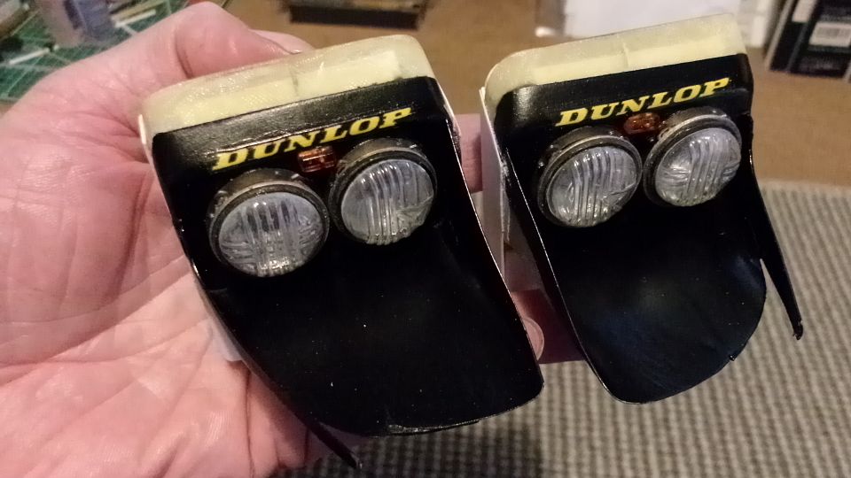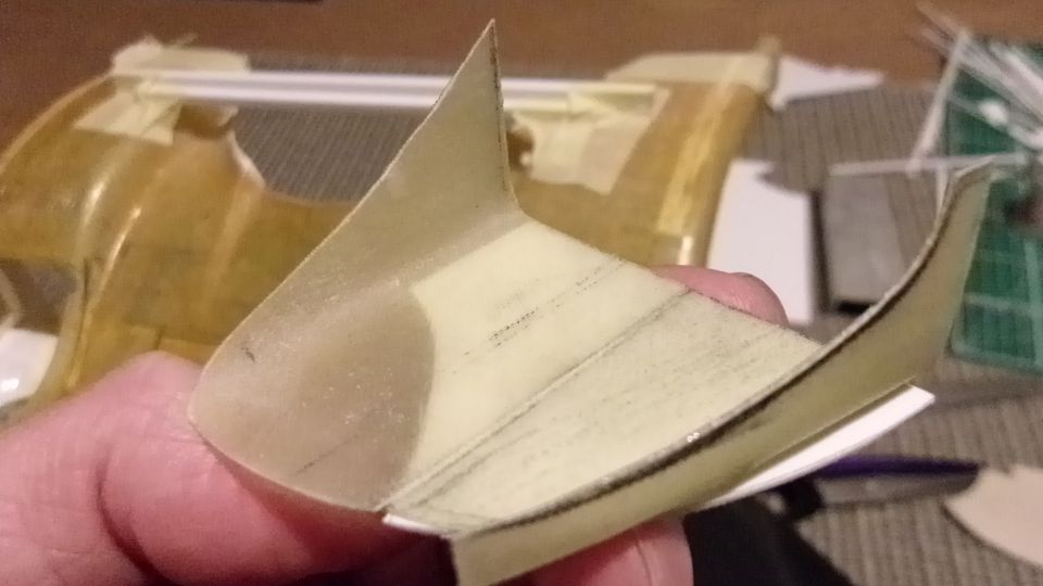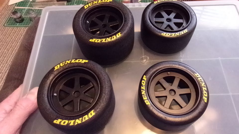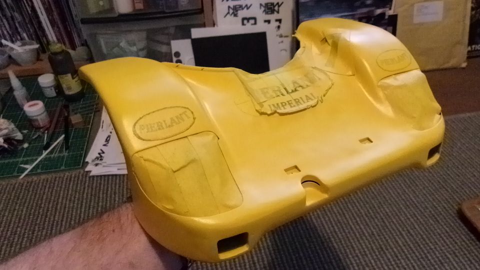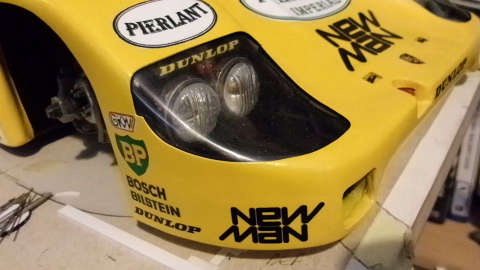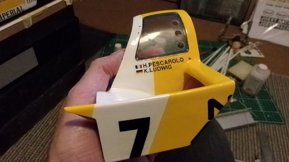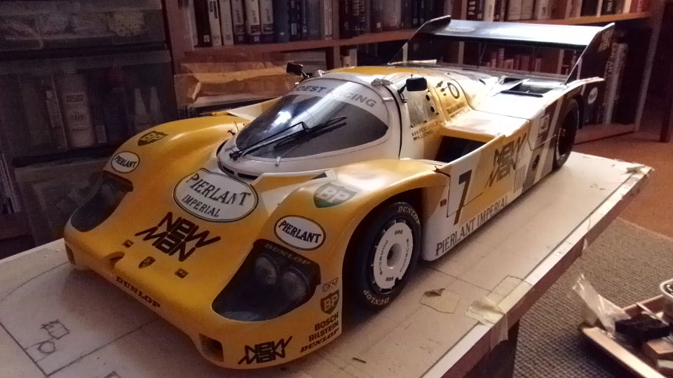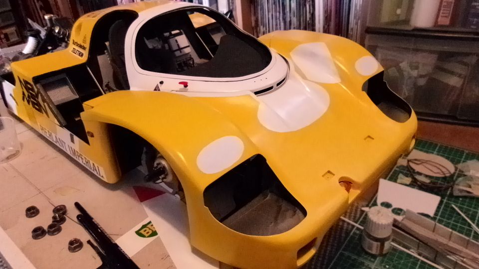 One word to describe the last few weeks: frustrating! From mid-March I’d been making week-by-week plans of what I wanted to do with the 956 – the long Easter weekend was going to be a good opportunity to make good progress, and then the weeks leading to Le Mans. The day after my last update I managed to pull something in my lower back, so I wasn’t able to do anywhere near as much as I wanted to over Easter, and it feels like that has set the tone ever since! So, what’s been happening? Over Easter I was able to make masks for the large oval ‘Pierlant’ logos on the nosecone. These were positioned and the nosecone was sprayed with coats of Tamiya Flat Yellow and Lemon Yellow, as per the other bodywork. After removing the masks and a final rub-down with the micromesh I set the nose aside for a week before applying a coat of spray varnish. ![]() ![]() Adding the nose decals was relatively painless – it was actually quite pleasing to see them bringing the panel to life. The large Pierlant oval at the base of the windscreen needed a little softening with MicroSol to help it fit the contours of the panel, but no big dramas. A second coat of varnish was applied afterwards. ![]() I cheated slightly with the headlight pods – the Dunlop logos should be applied to the clear cover panels, but I felt it was safer to put them on the fibreglass pods: ![]() A little later I fitted the headlight pods and covers – really pleased with how these came out: ![]() Next job – apply the Dunlop logos to the tyres, then assemble the wheels: ![]() The decals on the engine cover and wing went on okay. I had to re-print the green BP shields using white decal paper, as the originals on clear disappeared as soon as I put them on the black bodywork! My idea of spraying the background areas then applying the clear decals worked well, even if it did require a lot of planning and preparation. The large ‘Joest Racing’ on the underside of the wing went on so much easier than when I first tried it several months ago. ![]() ![]() I should point out that there will be plenty more photos to follow when the 956 is finished – it’s reaching the stage now where I don’t want to spoil the surprise! Getting the windscreen and surround fitted was another period of frustration. My original thinking was that I could glue the screen in place, then use the surround to cover the join. However, even with the screen cut from thin 0.25mm plastic it was soon clear that it would need to be somehow pinned in place before gluing. Having pinned it, I couldn’t cut the pins back flush, so I had to put holes in the surround – which meant I had to fill and re-paint the surround while it was on the otherwise complete top section. It was a painful sequence of ‘one step forwards, two steps back’ which shouldn’t have been such a problem. ![]() The sunshade band across the top was relatively easy – I used a copy of the screen as a template to cut a piece of 0.25mm styrene sheet, sprayed the end red, then added a suitable ‘Joest Racing‘ decal. It’s fitted under the screen (for a smooth finish), rather than being applied on top. Doors next. Before masking and spraying the yellow sections over the white base I wanted to check the fit again – and inevitably, things had changed. The fit along the leading edge was not as good as it had been – I don’t know if this was because of the frames I’d added to support the doors, because the top section itself had moved slightly, or whether the doors had taken a ‘set’ having been laid down for several weeks, Whatever the reason, I had to try to improve the fit before doing any more painting. I certainly wasn’t going to completely remake the doors at this stage, so I settled for doing a little surgery on the support frames I’d glued to the inside of each one, gently trying to tweak the curvature to better match the main body. It’s an improvement, but it was always going to be difficult to get them to fit properly. After masking and spraying the yellow to match the main bodywork I wanted to get the side windows sorted out before applying the first coat of varnish. Again, the 0.25mm clear sheet was going to need some encouragement to stay in place, so I switched plans and decided to vacuum-form the side windows instead. This would take care of the curvature issue. My first attempt was a shambles. I carefully cut and shaped a section of blue foam, added a layer of draughting film over the top to give a smooth surface...and didn’t consider how much heat would still be in the plastic when it was pulled down over the pattern! What should have been a nice smooth curved surface was rippled and distorted as the heat melted the foam… So, plan C: make resin patterns to get the correct curvature. Easy enough in theory, but another week’s work to lay-up more fibreglass, make the two ‘casting boxes’, pour the resin, let the resin harden, then smooth it all down again. The vacuum-forming process didn’t go smoothly, either – with the headlight covers and lenses I was able to get perfectly clear ‘pulls’ that only needed trimming to shape before use. With the side-windows, I had four or five attempts – and every one was cloudy or distorted. ![]() At this point, saying that I was ‘a bit fed up’ with things was something of an understatement! With everything else that had been happening since Easter, this was too much. I couldn’t understand what had changed – why wasn’t I getting the same results as before? Why was it that with the 956 so close to completion I was now having all these issues with relatively minor things? A few weeks ago I’d felt that it would be possible to have the 956 finished before Le Mans, but this was clearly now unrealistic. So, I did the only thing I could – I had a couple of days break from modelling, and considered my options. Whatever was causing the cloudiness and distortion, it appeared to only be on the inside of the 