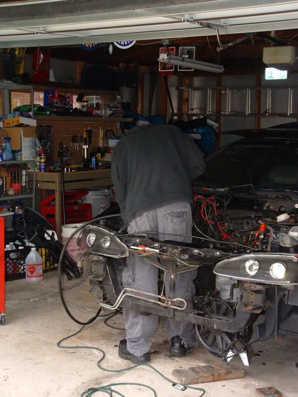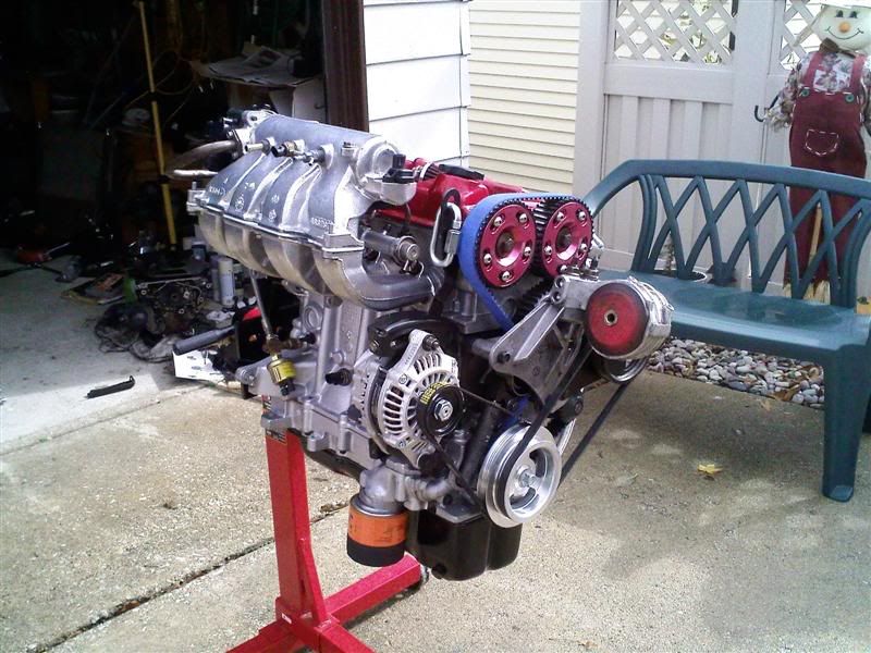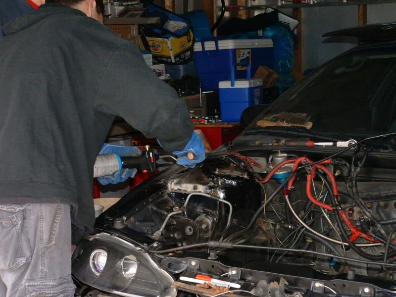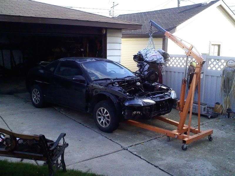What a day, that's all I can say. Was at the garage for 13 hours today! What a day. My mom took a ton of pics today so I'll have more posted up in the next couple days. The fuel injectors came in yesterday. Got some RC Racing 750cc high-impendence. Got those in the rail, and wired them all up. Came with all new O-Rings and everything. ![]() Bought a new alternator and a bunch of stuff. Got it all together. Sadly, a lot of stuff had to come off in order to get the thing in the bay. Retarded. ![]() ![]() Rented a hoist at a local place. And got her mounted. Clutch is torqued at 95lbs and did the pressure plate as stated above. Thank god for Jason having his phone on him. ![]() Sexiness is the key word on this pic. ![]() It took a long ass time to get the motor in the bay. The thing just did not want to mate up to the tranny. Was getting aggregated badly. As the motor was on the hoist, I bough all new chain (2500lb-er ) and new clamps. Sadly, I only bought 2. I used the locking c-clamp things (2 of them) for top of the hoist where it lifts up. While getting the motor in the 3rd time, the 2 on the both snapped and flew off. The motor was literally just hanging on. I was so pissed I rush to hardware store, set motor on the car, and redid the clamps. VERY close call on that.Later that night, was working on it again and one of the studs in holding in the mount on the exhaust side snapped off. So again, motor was hanging by nothing but 1 bolt on that side. Luckily, we made it happen. So now another stud is broken in the head... while I just fixed the other broken one today. Had so many problems trying to get the thing on to the tranny. I forgot to remove the lower tranny shield, so I was basically crushing that while trying to get the motor in. Stupid. Then once the drive shaft was in the clutch, it was impossible to rotate the motor to match the bolts up. Such a pain in the ass. Where she sits as of 10pm tonight. Right now it's all mounted, just missing the front and rear motor mounts, but those will go in tomorrow.