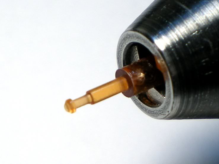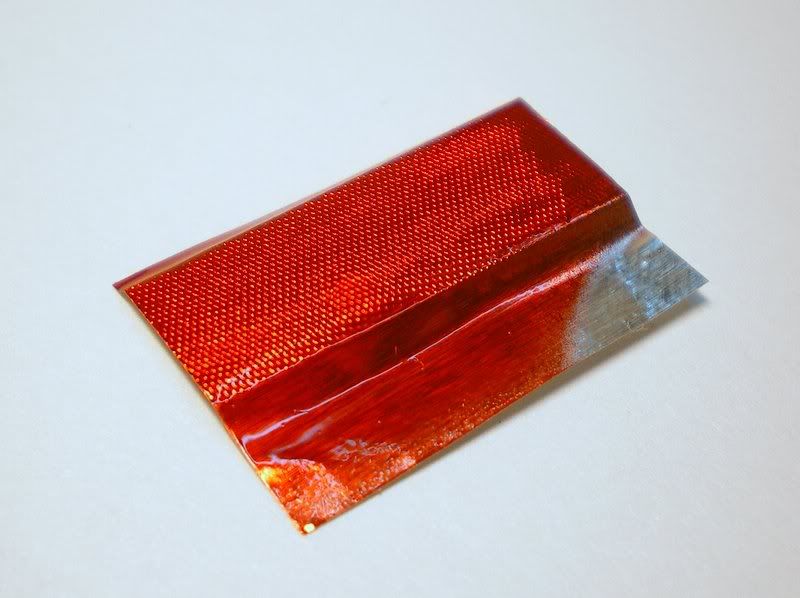 A previous attempt. I took some amber sprue and made these minuscule little cones. Far too small to work by hand, the rod you can see has a conical hollow in the end which I used to hold the lights while I sanded down to the correct size. They came out perfectly, but the problem is, when you get down to this amount of plastic the color just fades away to nothing. I could have painted them but that sort of defeats the purpose, plus I have no answer for getting that foil behind them and attaching to the car rigidly. ![]() I also tried a pin head shaped in the Dremel. Looks promising... ![]() It'll mount through a hole and the flange will make for a nice seamless finish against the body. ![]() In place and painted. Ouch! Looks like crap! ![]() I guess you just have to have some transparency in there to get a realistic look. Admittedly, this was a horrible polish and paint job, so ymmv. ![]() So back to the orange plastic, this time it will have more depth to it, as it goes through the hole in the body. ![]() The Dremel makes for a great lathe. ![]() I put a bit more shape into them, the cones look a bit bland imho. ![]() ![]() They come with a light switch ![]() ![]() The transparency makes them more life-like. ![]() A bit of finger grease here by the look of it! ![]() ![]() I wrapped them in foil to try to capture the glow. I suspect this is not the best way to do it, but it'll do. ![]() Makes it a bit darker with a bit of a glow. ![]() Now, the 3rd brake light. The kit decal is just a blob of red, looks very ordinary. I needed to get some texture into the foil, best I could do was this file. I really wanted a very fine cross-hatch pattern but couldn't find anything suitable (we're talking *very* fine here...) ![]() This came up nicely, the color is superbly rich with nice depth and transparency to it. ![]() And the shine is just unbelievable. That's not orange or purple in there, it's reflections and what have you... ![]() This is cool - I can cut shapes out of this material with scissors. For lights, reflectors, etc. ![]() Before: ![]() After: ![]() The light will look very good I think, but what I really wanted was this: ![]() I tried but failed to pull it off - anyone up for the challenge???