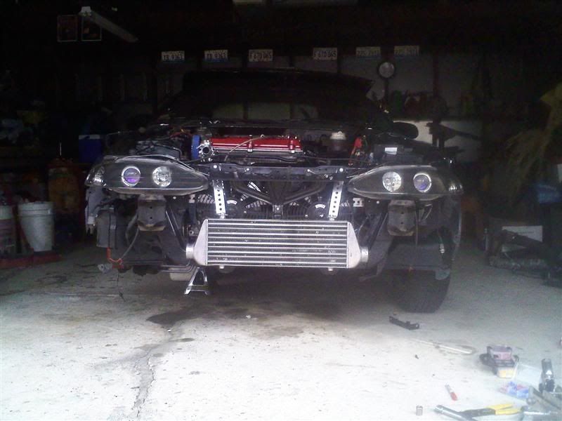 Big progress made today. I got there nice and early today after not being able to sleep last night and was excited rolling in. I finished mounting up the tranny to the block and getting the rest of the mounts in. I start hooking up the slave cylinder to the fork and adding in fluid. The slave and the fork look a little 'off'. Something about it didn't look right, and there was no play at all on the fork. I called Jason (my hero for the week BTW) and told me there should be play. I pulled the little rubber cover off and see the fork wedged between the pressure plate and the little pivot ball in not in place. I was pissed thinking I would have to pull the motor again. I seperated the tranny from the block as much as I could without releasing the whole thing, and after ~25 minutes of trying, got the fork on the pivot ball and on the TOB properly. You could just tell that it was in the right place then. Best pic I could get of it... ![]() Once this was all fixed, I filled up and bled the clutch. My god this thing is stiff and feels like a clutch. The last 2 I had always had a soft touch, where you couldn't feel where it was being disengaged. This one it's obvious. Feels great. Have to workout my legs a little more though. City driving will be hard with it. Once that was in, I had to reinstalled the alternator and the crank pulley (pulled off yesterday) and did the belts, rechecked timing, got the PS all up and hosed, and attached all the wiring. Those saying that it would take forever to find where each harness goes... I think I've done this too many times... took 2 minutes to hook them all up (I timed myself )I then made my mounts for the FMIC and redid some of the piping. Drilled out the broken stud from yesterday and welding in a new stud. Did some painting. Basically got everything in the car. Made HUGE progress today. ![]() So tomorrow, I'm taking the day off of work and finishing her up and take the hoist back. I have to pick up some extra fuel line since some SS I ordered is still on backorder, reattached the lower cross member, fully installed the manifold, turbo, WG, and make a custom DP, and it's ready to fire up. MSns is not fully wired, so will use stock ECU for all control to begin with at idle here. I don't plan on it leaving the garage. Hopefully I have no leaks and it's perfect straight out the box. Wish me luck for tomorrow.Pic at about 6pm tonight.