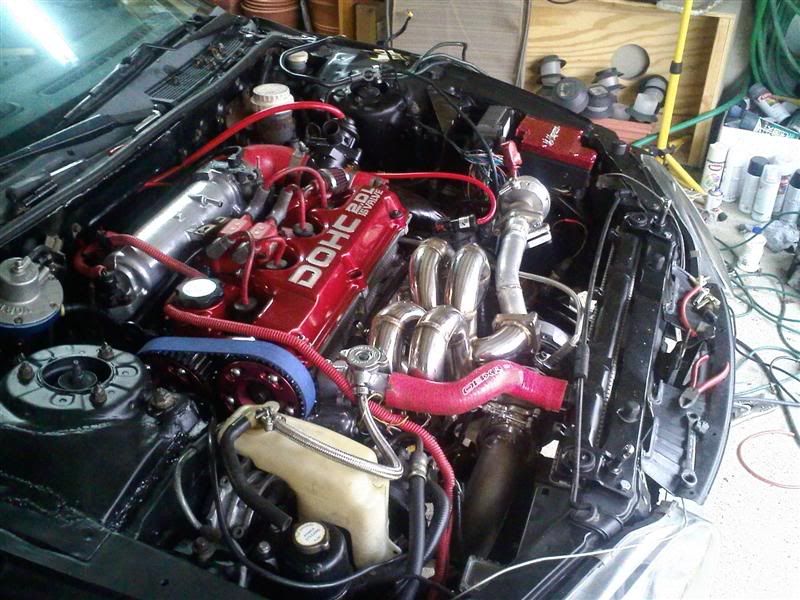 </rant> Because of that, I didn't get to finish her up today. I worked ~12 hours on her and she's so close, but not quite yet. Let's see what I did.. -Installed crossmember and finished back of block wiring -Fully mounted manifold -Mounted turbo -Made WG pipe and mounted that. Need to make dump tube now -Ran ~95% of vaccuum lines (no turbo) -Redid melted wiring harness by timing belt -Did some wire tucking -Finished all fuel lines -Started on new DP. This is actually what slowed me down then. If you look at my tutorial I have in the tech section, I made a little 4" sectional to connect the DP to the flex pipe. Well I had enough pipe to get rid of that. I started cutting and welding, and called it quits tonight on that... too tired. I'm betting the stiffer clutch pedal is from it being a heavier clutch. I don't remember the rating, but it was a ~375lb torque capable plate or something like that. It feels perfect. When I was in Dustys car last year, it felt just about the same. Feels perfect to me now. So what's left is to finish the DP and finish MSnS. I don't know when the next time I will be there will be though. ![]()
