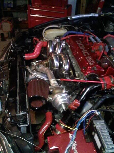 Got some more work done today. Let me start off by saying, I hate this manifold. So many things about it suck. I broke the T-Stat housing trying to bend that out since the one tube is dead against the hose then and wont fit right. Plus, my turbo is so big that it's a PITA to get it all fitted properly with that damn WG flange right in the way. WTF were they thinking. I had so many problems with it, I nearly pulled it off and put the log-style back on. I hope to god that this thing does not cause any problems once it's altogether. I recommend not buying it, or putting it on. My .02.