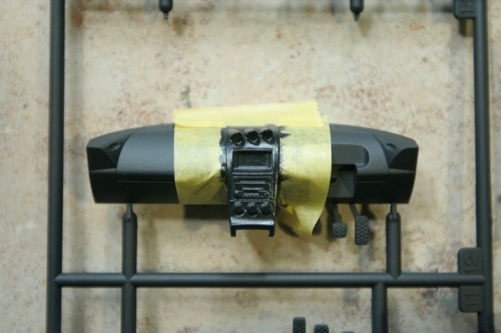 Ok, so today I started on the dash. Sprayed the whole dash TS 82 Rubber black, then masked of the center console and painted that the suggested mix between semi gloss black and flat white, the contrast is a bit extreme but ah well: