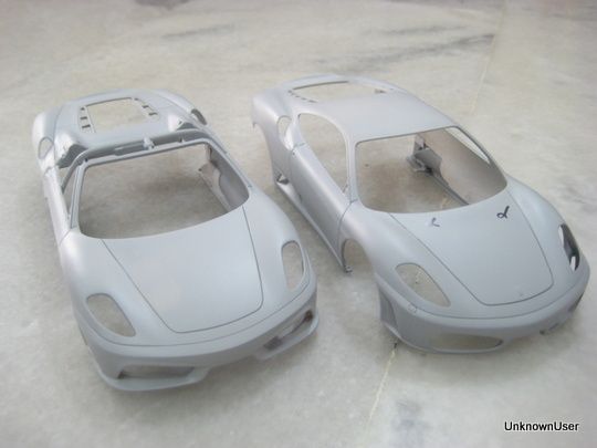 ![]() It’s my turn to update the progress on Scuderia 16M and the F430 coupe, still focusing on shaping and sanding the body smooth, as well as creating the panel lines gone missing after joining the front end and the body. As mentioned by Vince, after filling the gap with CA glue and baby powder, there are some holes seen after priming the body, so I filled the holes with CA once again and sanded them smooth. Working on both cars in a row can be tiring especially when you have lots of sanding to be done. ![]() ![]() ![]() Side vents and the sink marks on rear engine hood of the spider body were filled with white putty. ![]() ![]() ![]() More and more sanding before re-scribing the panel lines ![]() Primed the body and using a piece of plastic sheet as a guide, I re-scribed the panel lines on the front hood for the Scuderia 16M and the F430 coupe. ![]() ![]() Primed both cars again, errors on the hood were marked…more attention needed to make the body perfect and ready for paint. Wheel arc on the left side of Scuderia 16M was not curvy enough, more sanding and reshaping needed. ![]() ![]() ![]() Closer look to the panel lines on both cars: ![]() ![]() As you can see from the picture, I still have to work on the panel lines of the Scuderia 16M, especially the right side of the car. That’s all for now, thanks for watching
