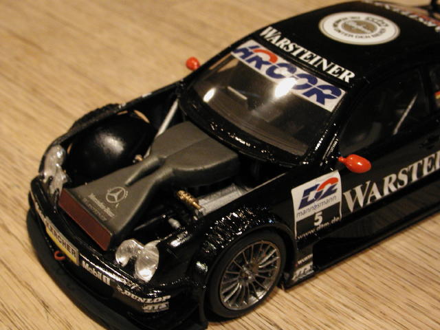 Here is what followed:After Stripping Some of the primer paint combination would just not come off so i had to press on. After priming again and an application of TS-14 (tamiya paint rules, im never going back) the thing looked half way presentable .Now on to the decals which go on beautifully. Then to a clearcoat... Now I know you are suposed to put on some mist coats and I did but aparently it was not enough. 3 decals ran a bit. The warsteinger logos on the hood ran a bit where the hood is a valley. One of the side DTM boxes ran a bit. The rear warstiner logo has lost half of its 'E'. Besides from those big problems and the fact that the car is now about 50% putty it was a good build . Pics follow and commetns are appreciated.thanks Matt