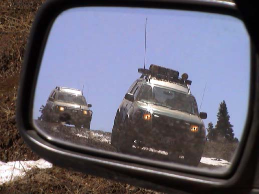 Mindie and Synchro in my mirror... the little yellow speck across the canyon is SlimeDog