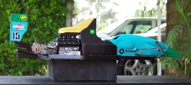 mickbench: Not sure how I keep it so clean. I don't find that I need to do a lot of painting on it I suppose, and I always paint on paper towels, etc, so nothing really gets spilled on the cutting mat. Time for another update. I've got a lot of parts in a half completed state, so a lot of what you see here is just fitted together without any glue as yet. I'm pretty happy with my first attempt with carbon fiber decals, but you'll have to excuse the odd small blemish. I'm at about the point where most things are nearly complete and all that's left is to detail the engine (after the decal disaster I'm not completing the engine cowling, at least until 2006/7-ish). I think though, that I've perhaps gone too far with the engine building, and if I start drilling holes and trying to add some things I'll destroy my current work and be unable to fix it. We'll see though, there's still some scope for detail work, given my meager(sp) abilities in this area. Enjoy the pics! ![]() The rear wing is just sitting there, so it's a little scewed forward. Will be fixed when it's permanently attached. I also put a slight wash through the silver section of where the drive shaft will go into the gearbox. My brushing skills are generally rather crappy, so the wash helped hide my sometimes questionable work... hehe. I aimed to keep the wash to a very small amount, so as to give the effect of shadow more so than dirt/grime, and it came out reasonably well. ![]() ![]() I've used the latest SMS Hi-Definition Composit Fiber Decals, and while they're of exceptional quality, I find them a bit bland to be honest. I think next time I'll use their older version which appears to have a bit more of a contrast between the white and black of the fiber weave. ![]() For those of you yet to try CF decaling, my further suggestions are to have a number of knife blades handy as you'll go through them quite quickly when cutting the decals out and making templates. And you must be as precise as possible when cutting the templates and decals out - they are somewhat forgiving, but the more accurate you are, the easier your job will be by far. ![]() ![]() ![]() All comments and feedback welcome of course. Cheers, M |