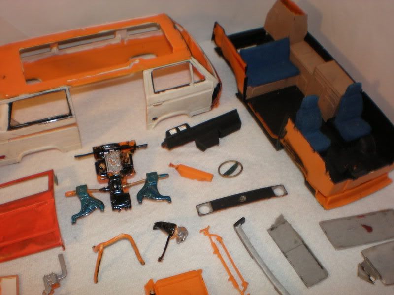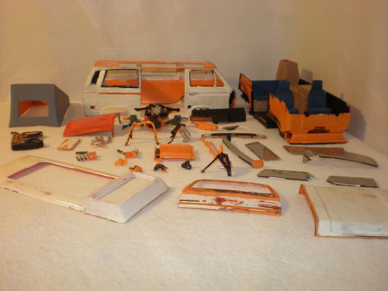 I have gathered some more pics of the van and ALL the parts I have for it.... BTW...I am not the model's first owner...the original owner was mentaly challenged....... .....and that's not a hole in the front of the body, that's black paint.(supposedly he tried to make a "LeBra"...which were installed on the original 1:1 vehicles) ps: If someone has or knows where to find some windows for this kit and would like to donate them, that would be greatly appreciated....(the ones I have are broken, cracked or missing) ![]() ![]() ![]() ![]()