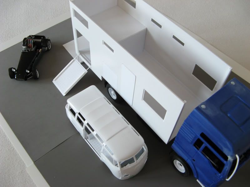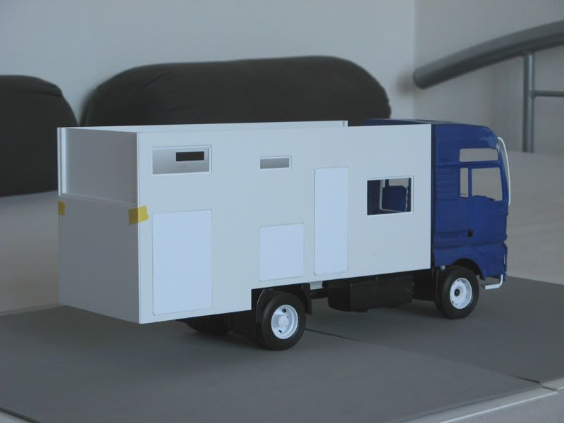 I accomplished some more in terms of "body-building" (the side garage doors might not be realized on the real truck). The basic "box" is almost completed, just missing the front wall actually. ![]() ![]() ![]() ![]() The rear opening was supposed to be a standard hydraulic lift like this one: ![]() But as I had to change the design to a longer overhang in the rear (with less ground clearance and departure angle) it became clear that there would be no chance fitting it. I played around a bit and came up with an idea that can be easily realized. Just look at the pics and you'll know how it works. There are still some parts missing, though. ![]() ![]() ![]() The interior will, naturally, incorporate the garage as a basic element of the layout. It takes up nearly a third of the interior's length. ![]() The bed and various cabinets will be on top of the garage... ![]() Here you can see it compared with a Volkswagen Samba bus (yeah....that's my surfin' bus. No WIP yet opcorn: ).![]() Well....you could also look at it this way ![]() I will work on it some more this weekend. As always, thanks for watching and keep the comments coming. Cheers Sebastian Last edited by voyageur; 12-24-2007 at 02:12 AM. |