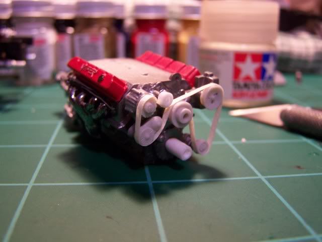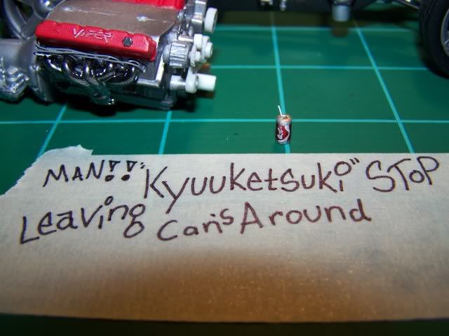The white lines are not to be there I fixed thim.![]() Heres somthing you all who don't open your doors, to make your door and trunk,hood line look more real fill them in in black by using Black wash. for all of you who have a Rustall kit use No. 2 black and some Fabric paint called FolkArt to make the wash darker this is just the same thing I used on the door panels. First without any filled in lines. Then with the lines filled in. ![]() ![]() ![]() This will help you make your model stand out more and if you do it right on some types of models It makes your doors look like they will open up. About the (Soda cans) I did this on my bed so the back ground is Red sorry for that, it makes the aluminum look like brass it's not just aluminum. See I ran out of styrene tubbing and all I had in theat size was aluminum tubbing you still can use styrene it's better and the work go's by faster. first Tube type & size: ![]() ![]() These are things your going to need to do this: ![]() Now ones you have measured the size of tubbing, make a cut line use your pipe cutter(do this 6 times) for a full pack. ![]() sand off the edges some times there sharp. ![]() ![]() now that you have both sides sanded off and have a full 6 pack paint the can holder Fl-White (I made one more can to show you tow diffent styles of can Co.s: ![]() ![]() ![]() For the straw I used DM Ing. wire Now fill in the tubbing with what ever type of fill you want from Testors to Tamiya it's up to you. I'll be back to post the painted images on the can later to day. OK no one wants to post so I have to just add to this thread. About the Soda I used tamiya Red Clear Testors Fl-White,Silver for the Coca-Cola logo wile looking a an image of a coca can for placemint of the image. Remember paint the can holder Fl-White. Tell me what you think on this one, now I'll put up some cola can for some of you who mite want to make some for your selves. ![]() ![]() ![]() ![]() ![]() Cola Images for one and all. ![]() ![]() ![]() ![]() ![]() ![]() The next images are of the me making fake Carbon Decals for the drive shaft and making pullys and belts for the engine. I'm going to rap this thing up soon. First I found the images of Carbon Fiber I need for the decals and cut out all the images and tapped them together then, I Made a copy of all the tapped images on to Testors decal paper and then sprayed them with the bonder and let dry over night. Placed the new Decal on the Drive shaft and put Tamiya Clear and let Dry. To make the decal darker i used tamiya Smoke clear. ![]() ![]() ![]() ![]() ![]() ![]() ![]() I know I know why didn't I use the ones from Scale Motor Sports well I wanted to but the Company has moved and is not up and running well yet so I need to go on with this project. Well now I know that the hole thing (the Decal stuff) Works so I can make other stuff with it. NOW for more Engine work. First I made some A/N Fittings for the Oil cool can and oil sump pump when I made the Soda can how to for Kyuuketsuki. Now I need to put pullys on the engine I lost the kit ones I'm glad I did (lost them) that is the one I made up from old parts work out well tell me what you think. ![]() ![]() ![]() ![]() ![]() ![]() ![]() MAN!!!!!!!Kyuuketsuki STOP LEAVING CAN AROUND!!!!!! ![]() ![]() I made pully belts out of masking tape: ![]() ![]() ![]() ![]() ![]() ![]() ![]() ![]() ![]() MAN what's with all the cans? ![]() If you keep leaving half full cans laying around some things is going to go rong (It did) I went to lunch and came back and found this- ![]() !!!!!!MAN!!!!!WHAT!!!!!THE!!!!!@#&&!!!!! Do you know how much that Engine cost now, I'm going to have to rip the block down and start all over MAN!!!!! ![]() All of that was just for fun. To make the Coca spell I mixed Tamiya Clear Red & Smoky, a little more Smoke than Red ok. Next I going to have to make a Radiator yep I lost that one to. "LOL" Good thing that, I know how to make stuff. I'm going to use some fans' from ethere a Corvette or Camaro. I want that two fan look on the out side or the front of the radistor. I'll be using Brass Mesh, your going to like this one. (Let me know what you thing so far on my work). (Kyuuketsuki)-how did you make the 6 pack can holder? White_r34-(the can holder come from Detail Master you can order DM stuff from Hiroboy It's in a kit called Interior Junk #1 stock No. #2380. also, did you hand paint the individual cans? Yes it takes some time but I did it. painting the words was the hardest. You will need to use a No. #18/0 fine line detailing paint brush.