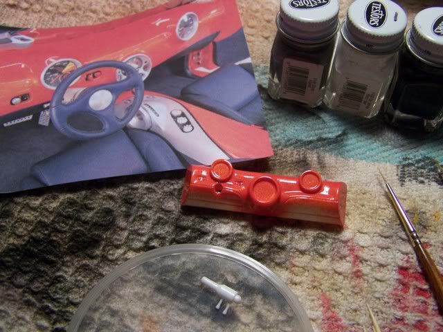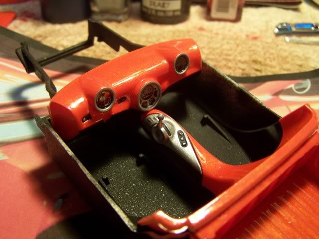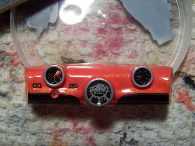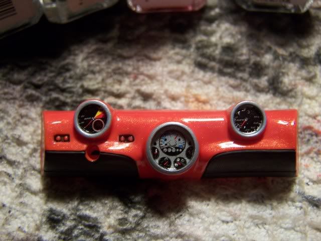 Ok here's some of tha Interior work. After I painted the gauge bezels I had to use decal softening solution to make the decals sit better one of the decal came out bad the one on the far right, then I fixed it with fl-black & fl-white, then I coverd them with TAMIYA Clear Gloss. I don't have steady hand to paint with in thine lines so I used Rustall mixed with FolkArt to make the lines darker (that way I have a guide to start from) and I have just started the flocking hope you like. This is what's in the images.