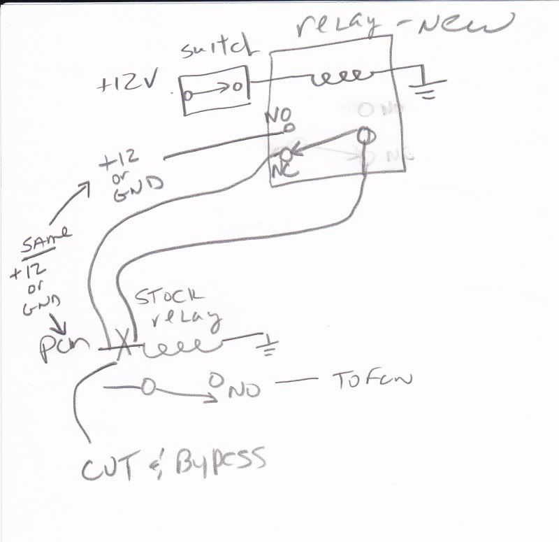 The fans never turn on - that's exactly the problem. Chevy engineered it to where the fans come on at 230 degrees.... that's way too high for my comfort. My fans to my knowledge have never come on due to the temp getting to high. Only by turning on the A/C. The tstat is 195, the PCM turns on the fans when the ECT reads 230, that's 35 degrees above normal operating temperature. I think that is just bad design. I would rather have some wear an tear on the fans than my engine running that hot. wouldnt rely on the dash gauge, hopefully you have an infrared temp gauge like I do and can measure the temp at the t-stat more accurately than the gauge. I think the gauge would pretty much have to be pegged out to the right before the dam fans come on. Or an ODBII scantool to pull the temp from the computer which is more accurate. If you are overly concerned, I'd tap into the a/c signal that turns on the fan relays and have a manual switch to turn on the fans in rush hour if you didnt run the a/c. In rush hour, i have turned on the a/c just to keep the fans running and keep the temp down. I wouldn't do this unless you used a diode because your switch could trigger the A/C clutch accidently... just a bad idea. a better way is to break the signal wire between the PCM and fan relay coil: in my diagram, I assume the PCM delivers +V and the other end of the relay coil is grounded... of course this may be backwards, with one coil contact is always +V and the PCM delivers a ground signal to the other end of the coil. you can add your own switch and SPDT relay. your switch can power the relay coil on the new relay. ![]() Note: you are tapping into the fan relay COIL, not the Common/Normally open contacts i dont know if the PCM supplies +12V +5V or ground to trigger the stock fan relay, if you want to do this then youll need to see what the signal is. you match this signal to the NormallyOpen contact on your new relay. when you turn on the switch your new relay activates, bypassing the PCM signal (which NEVER operates when you want it to) and you send +12V/+5V ground signal from the normally open contact to the common contact and this signal turns on the fan relay. you gotta cut the wire from the PCM to the fan relay in the fuse block and wire the PCM signal to the Normally Closed contact on your new relay and the other end of the cut wire to the Common contact on your relay. The Normally Open contact has a constant +12V/+5V/ground (to duplicate the same signal the PCM delivers) the effect is, when your switch is off, the fan relay is controlled by the PCM. when the switch is on, YOU control the fan relay.