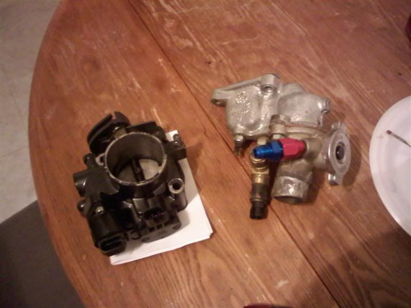 -Still waiting on the rest of the rings to come in -Cleaning up the MegaSquirt wiring that I had all rigged up like in the previous pics. Need to get some loom to cover them all now. Actually got the stock ECU wiring cover to fit over all the wires with some modification and it's looking good. No pics of that yet until it's done -Did bunch of other wire tucking -Finished up the throttle body. IAC is completely disabled and the passage for the idle air to flow is completely blocked (with pennies ). Also the port for the evap is now welded shut as well-Welded on a -6an fitting on the thermostat to the coolant reservoir. Just had a -6an line clamped up to it before and worked fine, just didn't look complete -Couple weeks back I was shifting aggressively and been having problems shifting into 2, 4, and R. Turns out 1 of the shifter cables had a metal piece pop out from this sleeve thing. I took it all apart and used new clamps and reinstalled. Feel perfect again. Hope it holds like that forever -Polished the compressor of the turbo. Took 5 hours, and far from perfect, but I think it looks good. It's shiny... and that works for me. I had painted it chrome originally but got fed up with the paint dripping off and getting all over the place when working on. Such as hassle and it didn't look good. Pic below -My boy with the IS300 is selling his rims from it and we decided to test them to see how they look on my car. Price is right, but needs new tires. They're pretty light too. Not sure if I'm going to get them yet though. Each time I look at the car with them on, I think of his MX6 since the body styles are really close. Opinions? ![]() ![]() ![]() ![]() ![]() ![]()