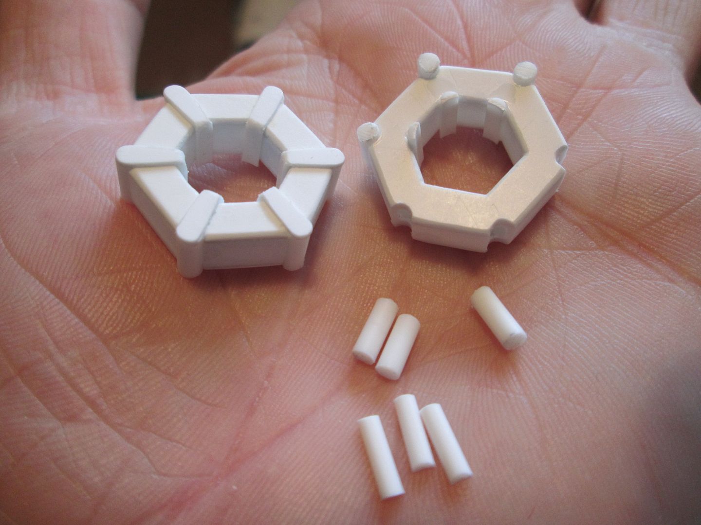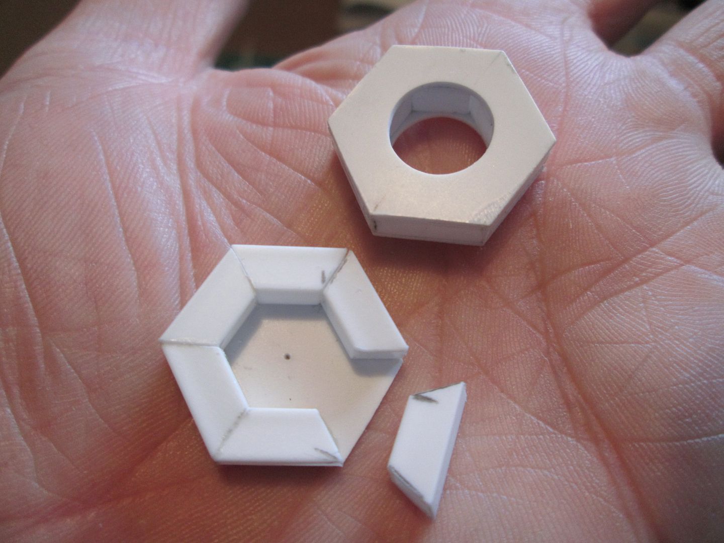 Yes, I've made a start on the driveshafts and a main part of these are the two rubber donut joints (as also seen on the 917, 908, etc). A simple enough shape, but there's quite a lot of work involved. First step was to cut the basic hex plates from 0.75mm sheet, using a template, then to add the six pieces of 3/16" box-section. Once glued together, the centre of the donut can start to be removed: ![]() Each corner was then filed away to create a groove for lengths of 2.5mm rod. The inside of the donut was filed away to give a smaller hex-shaped hole, and short lengths of 2mm half-round added in the corners. When the glue was dry, everything was filed back to flat with the top surface. The short connecting pieces started as 2.5mm x 0.5mm strips, rounded off at the end and tapered slightly along the sides: ![]() To connect the donuts to the shafts I need four 'spider' plates. I re-used the template I'd made during the 908-03 project and cut four from 1mm sheet. A bit of filing later and here they are: ![]() I might still slim them down a little more - I'll continue with the shafts and see how they look later. There will be hex-nut detailing to add to all this when it is assembled, of course. Now I have to start on the fun part - making the universal joints at each end of the shaft. It's going to be a fiddly job, but having already made something similar on the 908 I'll be looking for ways to improve them. This will keep me occupied through the rest of the week... See you next time, SB |