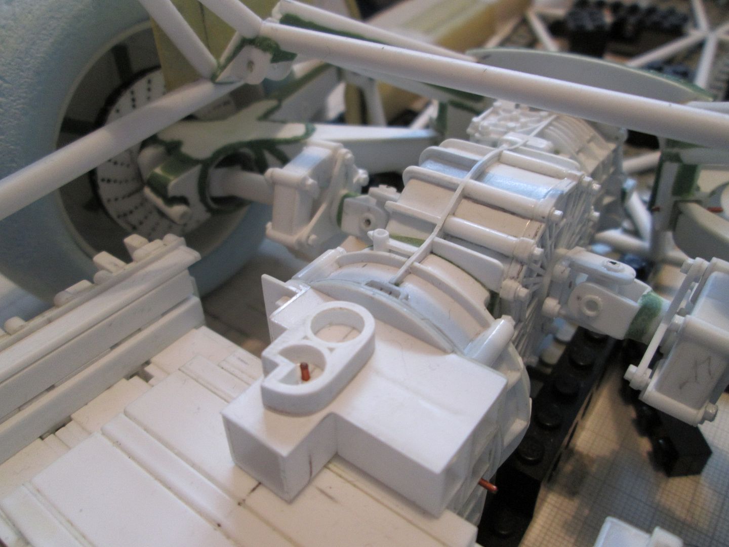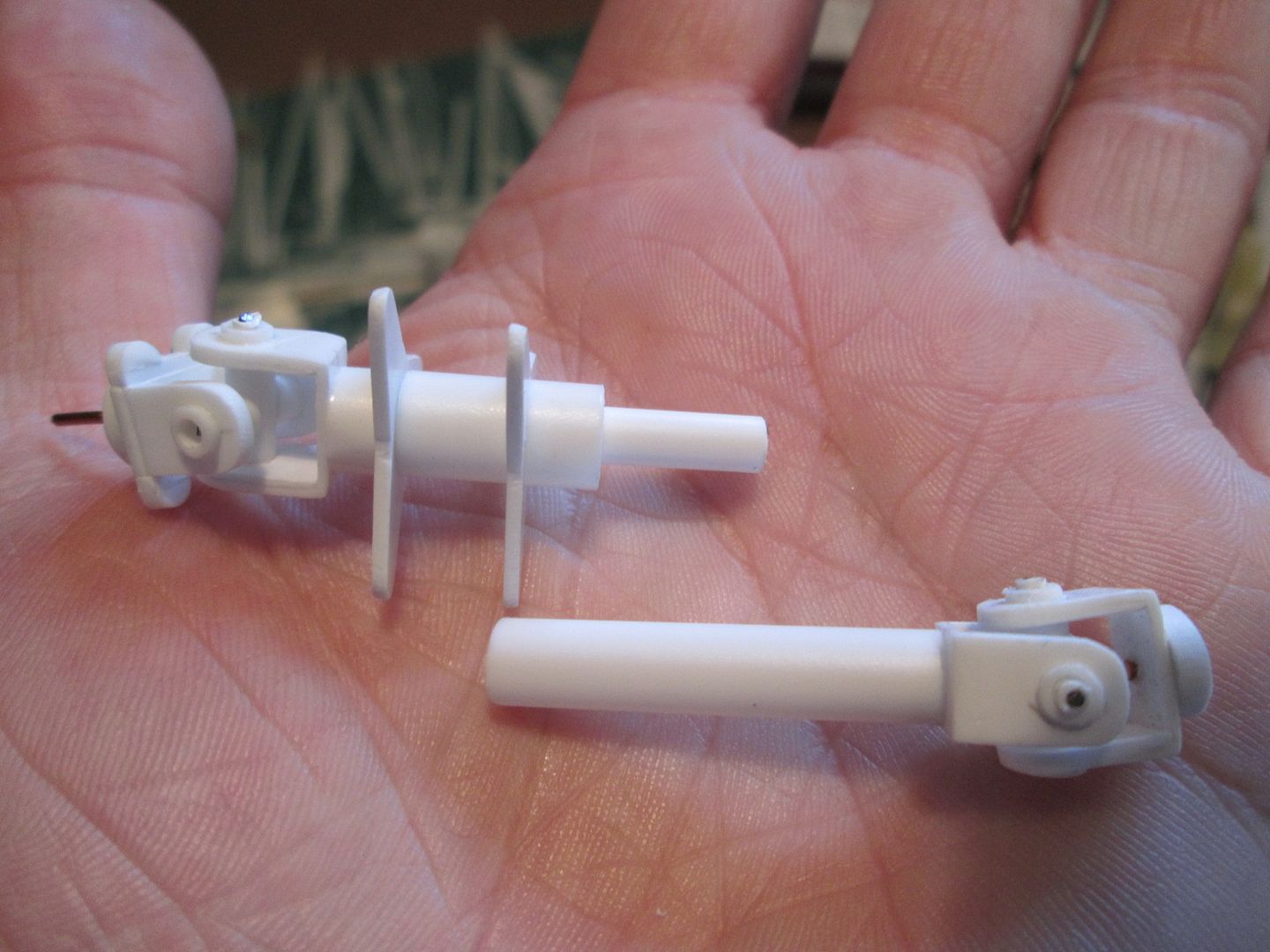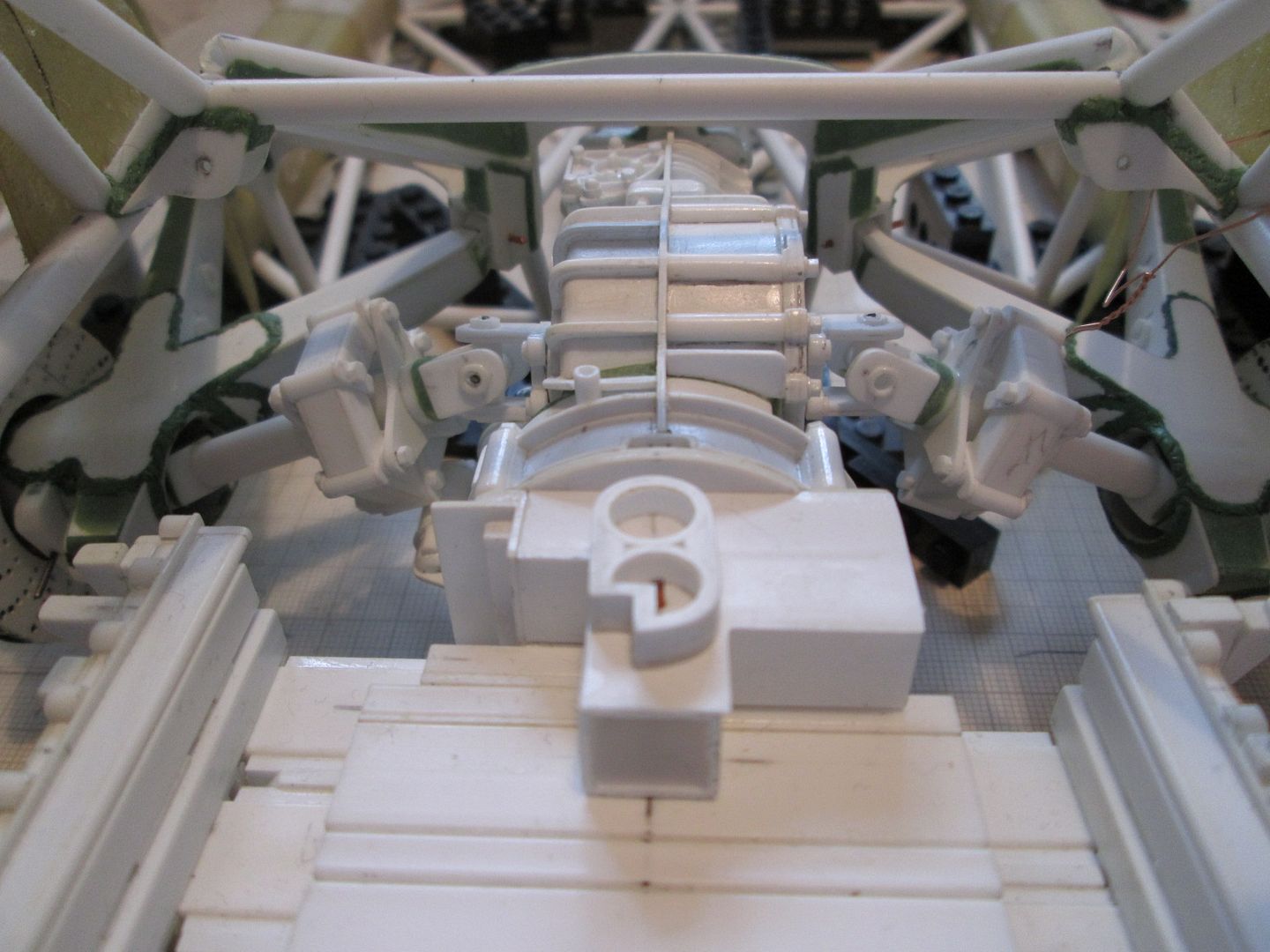 Starting point for each of the universal joints was two 1/4" lengths of 3/8" box-section; pilot holes were drilled through two sides, then the third side was removed to create the C-section. The inside faces were reinforced with two lengths of 0.5mm strip. The pilot holes were taken out to 1/8", then each half of the joint was pushed onto a length of rod (to make it easier to hold) whilst the ends were rounded-off with file and emery cloth. From here, each of the joint sections was modified to suit it's position on the shaft. The innermost ends (onto the gearbox) were given a slightly thicker base and some half-round detailing to create the gearbox output flanges, plus a central spigot to help locate them in place. The other half was given a two-stage spigot which would pass through the first of the two spider flanges. The outermost joint was designed to locate into the hub in the trailing arm, whilst the other end was attached to the driveshaft itself. To allow for a little movement as the suspension was articulated, the outer end of the driveshaft is able to telescope into the inside of the donut joint - an internal tube provides support. ![]() Here you can see the two complete shafts when assembled for a trial run. The spider flanges have been drilled through into the two donuts with short lengths of styrene rod used to hold everything together. The cross-shaped 'spiders' inside each joint are made from three short lengths of 1/8" tube, with pins pushed through from each end to allow them to pivot: ![]() In this next photo you can see that I've added hex-detailing on both sides of the donuts, to create the nuts and bolts which would pass through the spiders. The outermost ends of the shafts have been given a curved underside (using a section of large-diameter tube cut to shape) with some greenstuff to fill the gaps. The small pins pushed into the universal joints are not permament. Each shaft can still be broken down into parts to allow for easier painting (whenever that will be!). It's tempting to glue the donuts and spider flanges together now, but it would be very awkward trying to get a brush into the inside. ![]() The next job was to re-fit the engine and gearbox and see how everything looks. Here you can see the two driveshafts with the suspension on full droop - note how the left-hand side clears the starter motor: ![]() With the wheels fitted the driveshafts lift to a more conventional angle - just slightly below horizontal. The outermost universal joints are buried inside the trailing arms and nearly hidden from view - I could have saved some time and effort here by leaving out this joint completely, but that's not the way, right?! ![]() Another photo at ride-height, looking towards the back of the car: ![]() So, at this point the two shafts are about as complete as they need to be (for now). Time to move on to the next job! More at the weekend. SB |