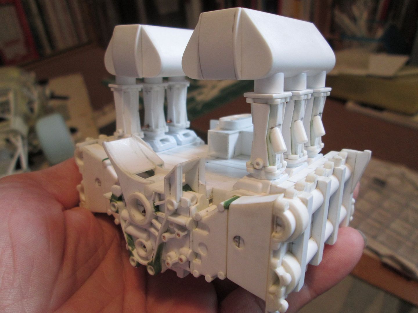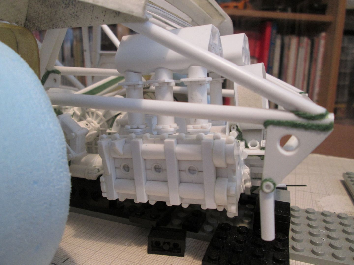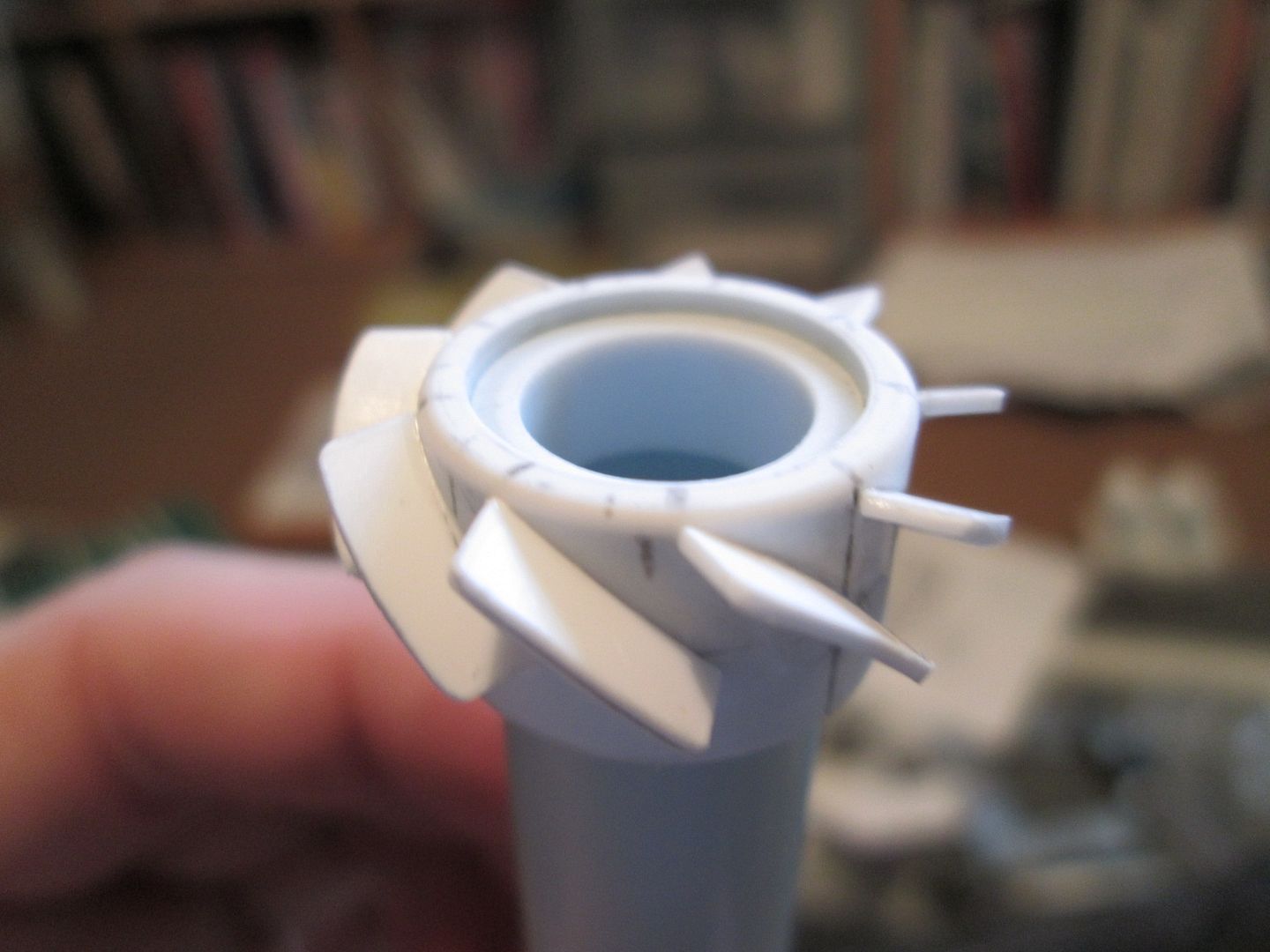 Quick update tonight - my connection keeps dropping out on me, so I want to get this on before it goes again! Firstly, in this photo you can see the intercoolers with the small curved end tanks added. I've also glued the three pipes to the underside of each one, although the square flanges are still free. You can also just see where I've added some greenstuff to the 'hourglass' plates on each of the right-hand inlet stacks - I'll show this better in the next update, as I have to repeat the process on the other side. ![]() Next, the fan housing. The main hoop was made from four layers of 0.4mm sheet wrapped around a 3/4" socket from a toolset (hey, it was just the right size!), with a 0.5mm flange added to the front end to tidy it up. Extra bands were added around the outside from 0.75mm strip, and a couple of bushes added - these will eventually provide the mounting for the alternator. Later this week I'll make the securing strap which wraps around the housing. ![]() Finally, the fan itself. Again, more layers of 0.4mm sheet, this time wrapped around a till-roll core. The blades are cut from 0.75mm styrene, about 10mm long by 3.5mm wide, curved to match the side of the central hub: ![]() I've reinforced each blade by drilling through and adding a single pin at the base of each one - you can't see them once it is fitted into the housing: ![]() The till-roll core is not glued in place - yet. This piece needs to be detailed and the central drive-pulley added. Now I can start to work on the shroud which ducts the air over the top of the cylinder barrels - this will probably start as a piece of blue foam. There's more work to be done on the inlet stacks and intercoolers, so I'll be keeping busy... Have a good week, SB |
