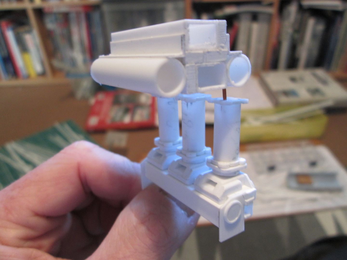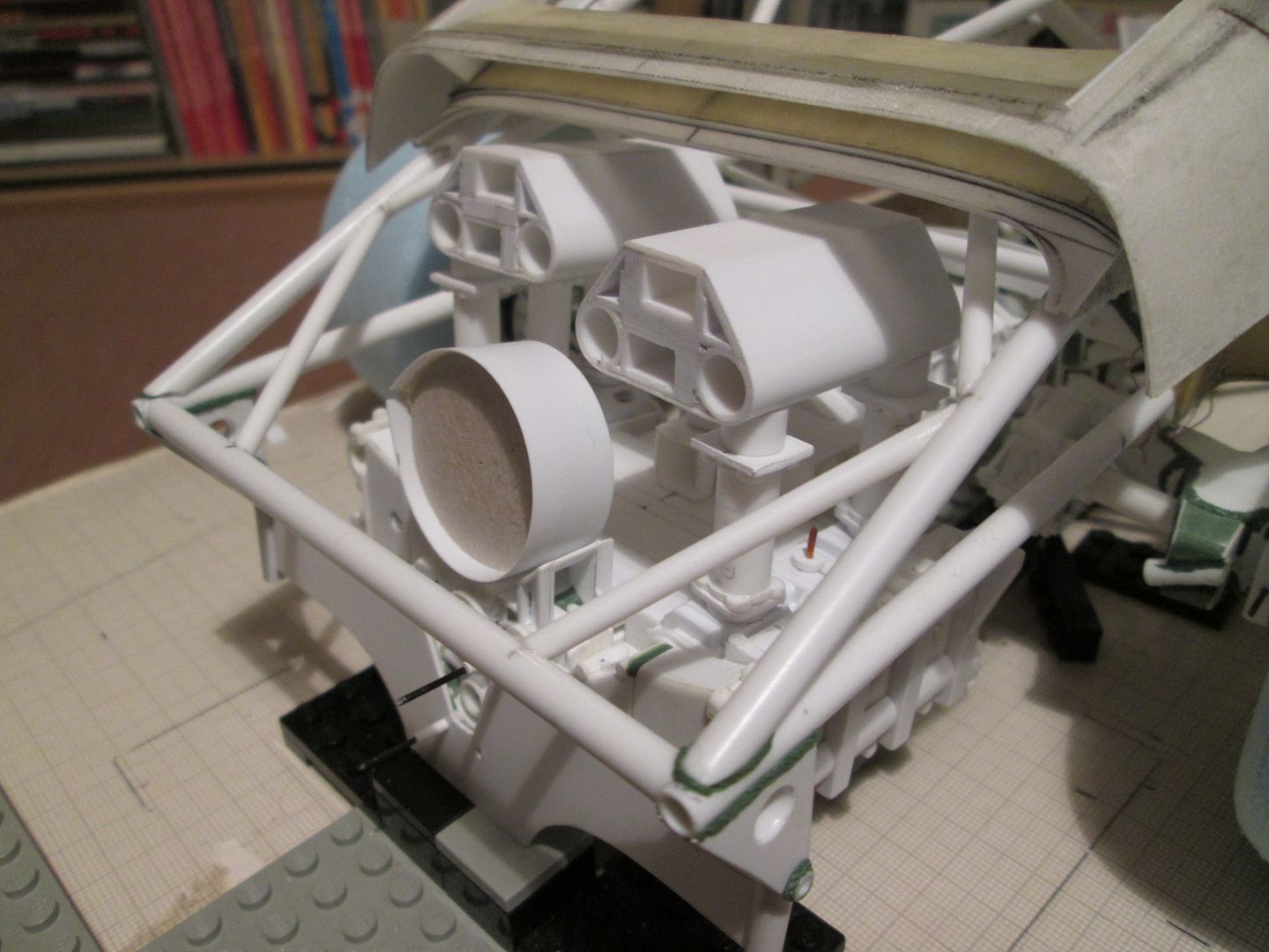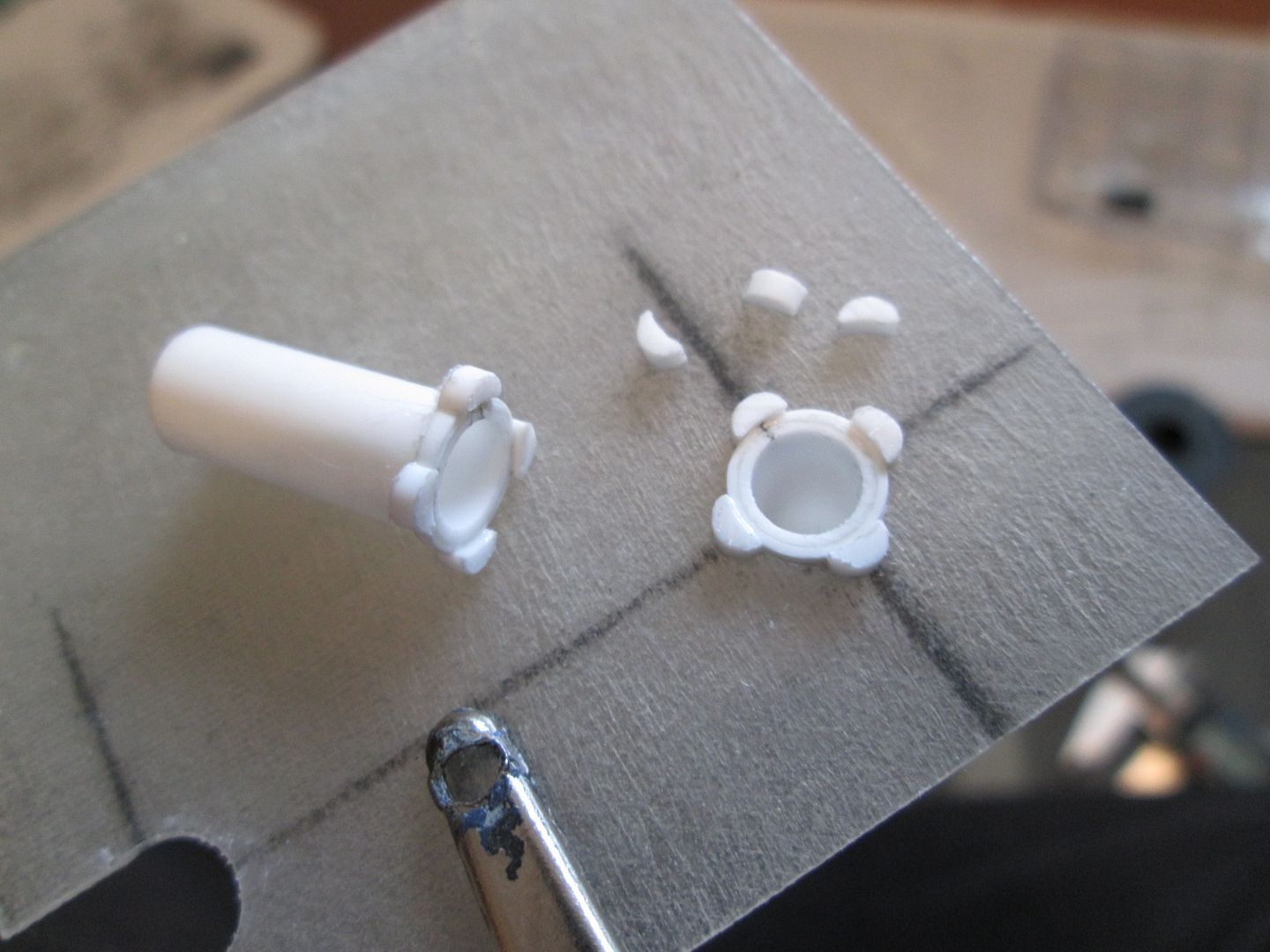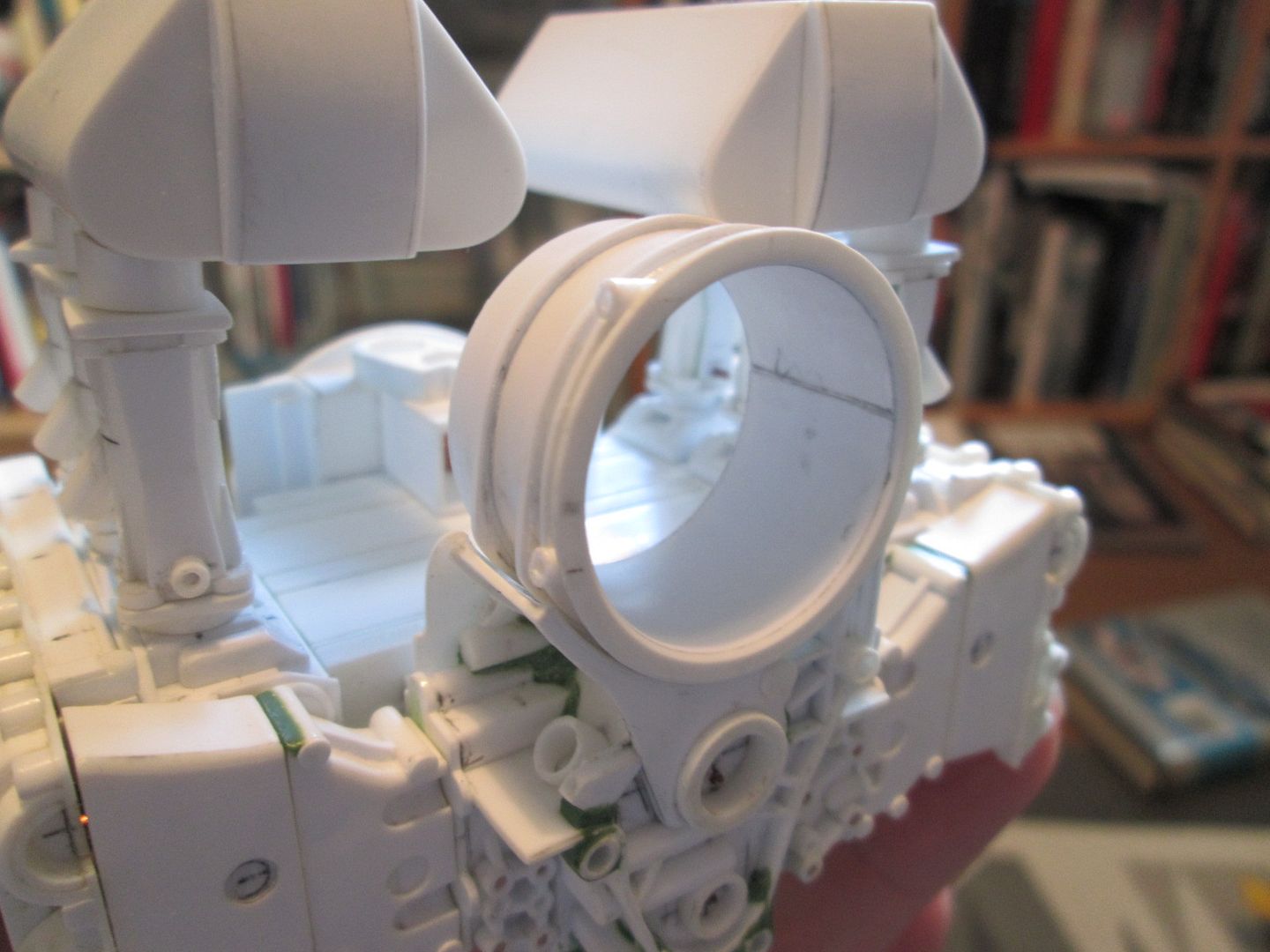 Quick update tonight - my connection keeps dropping out on me, so I want to get this on before it goes again! Firstly, in this photo you can see the intercoolers with the small curved end tanks added. I've also glued the three pipes to the underside of each one, although the square flanges are still free. You can also just see where I've added some greenstuff to the 'hourglass' plates on each of the right-hand inlet stacks - I'll show this better in the next update, as I have to repeat the process on the other side. ![]() Next, the fan housing. The main hoop was made from four layers of 0.4mm sheet wrapped around a 3/4" socket from a toolset (hey, it was just the right size!), with a 0.5mm flange added to the front end to tidy it up. Extra bands were added around the outside from 0.75mm strip, and a couple of bushes added - these will eventually provide the mounting for the alternator. Later this week I'll make the securing strap which wraps around the housing. ![]() Finally, the fan itself. Again, more layers of 0.4mm sheet, this time wrapped around a till-roll core. The blades are cut from 0.75mm styrene, about 10mm long by 3.5mm wide, curved to match the side of the central hub: ![]() I've reinforced each blade by drilling through and adding a single pin at the base of each one - you can't see them once it is fitted into the housing: ![]() The till-roll core is not glued in place - yet. This piece needs to be detailed and the central drive-pulley added. Now I can start to work on the shroud which ducts the air over the top of the cylinder barrels - this will probably start as a piece of blue foam. There's more work to be done on the inlet stacks and intercoolers, so I'll be keeping busy... Have a good week, SB |