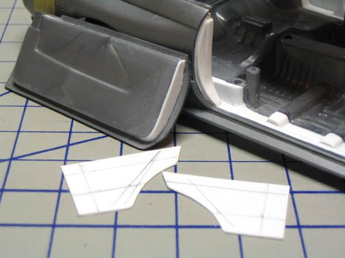 I've taken picture to show how my door panels are progressing thus far. In one shot, you see that the rear panes need some work as it just looks too one dimensional. It needs to be curved a bit and an arm rest inserted in there somehow. A similar treatment is probably necessary for the doors as well as they just look too flat. The last shot shows my start at creating the panels for the rear. Getting them to look just right and have it curve inwards is going to be a challenge. Now if there weren't any panels back there, I could just mock up some indentations here and there to mimic the bare metal, and leave it flat. If only I could take that shortcut...